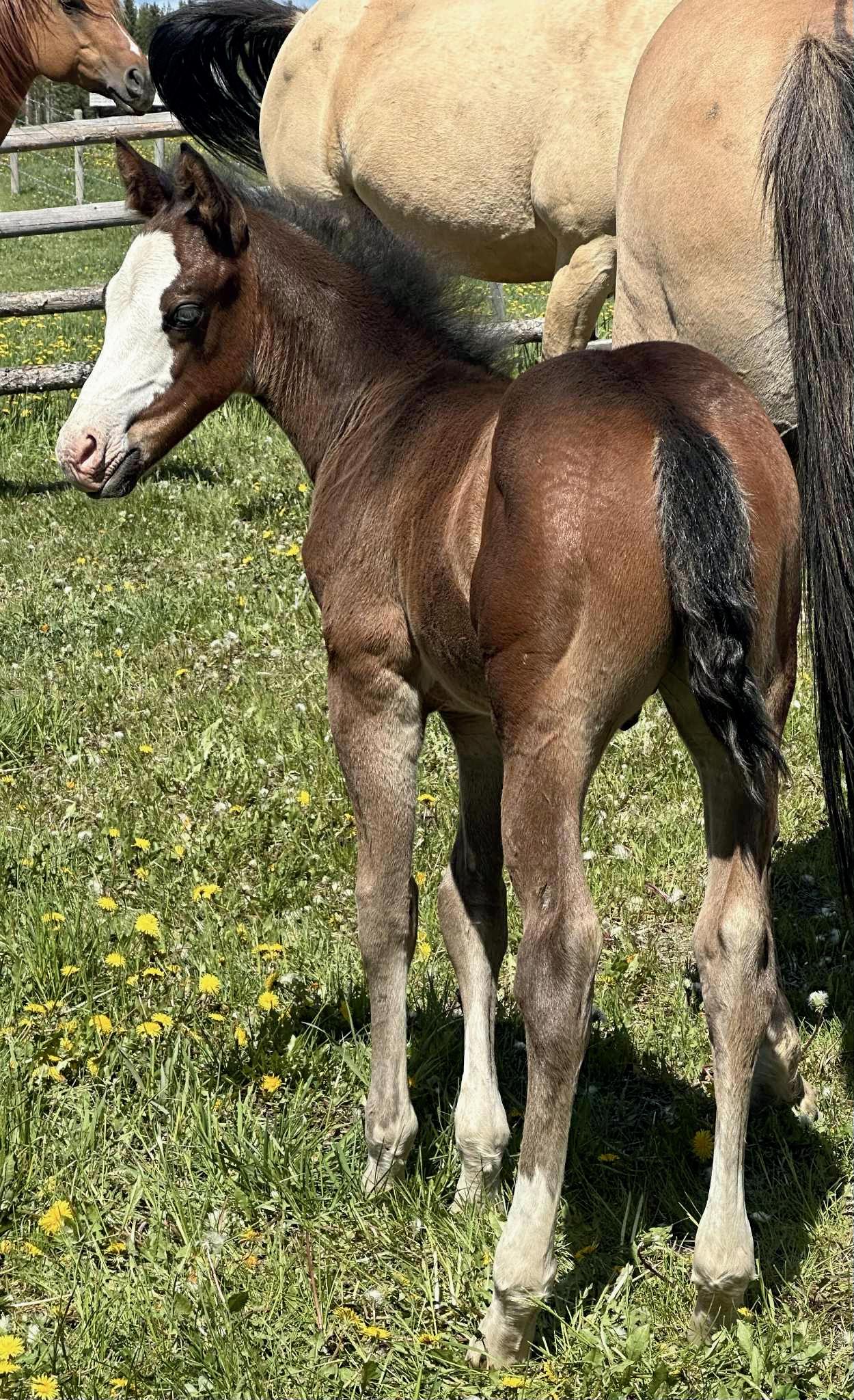 Red was born May 11, 2025. He is out of a well built red dun mare. His dam "Dun That" has thrown ranch style offspring with good hip, big feet and gentle disposition. Red's sire "Ima Metallic Gold" is everything you'd look for in a breeding program. He stands 15.1hh.