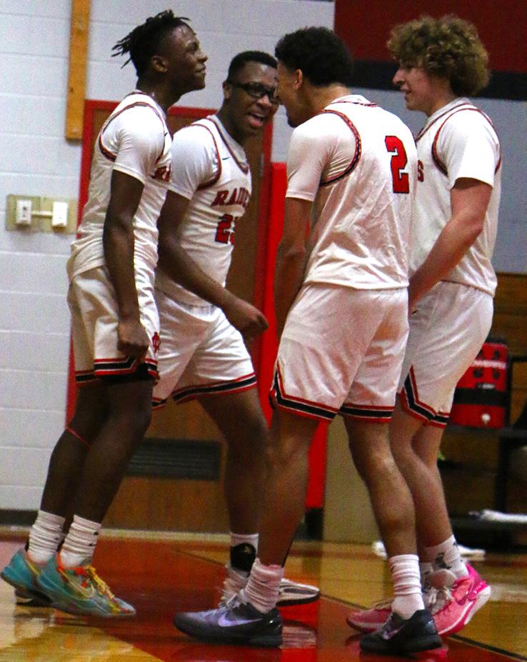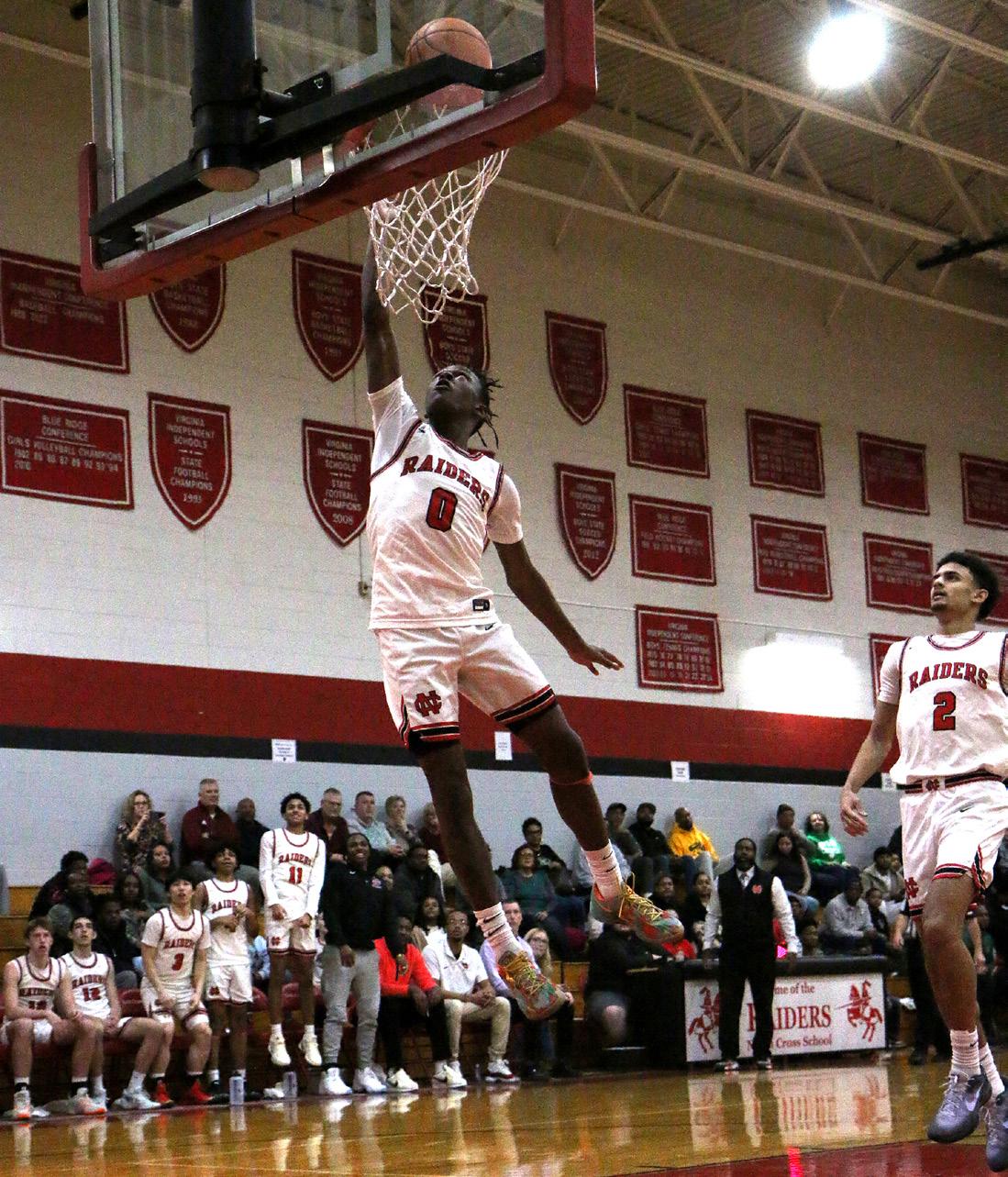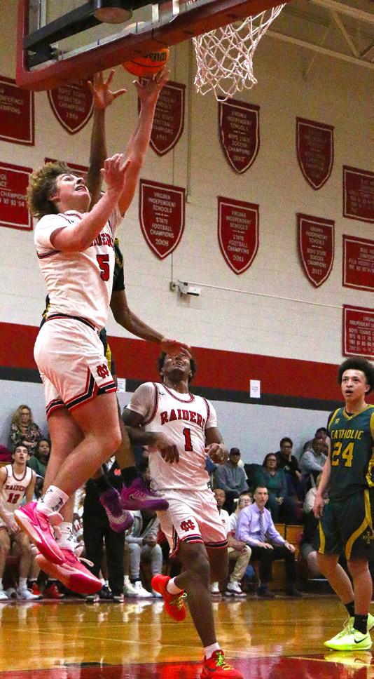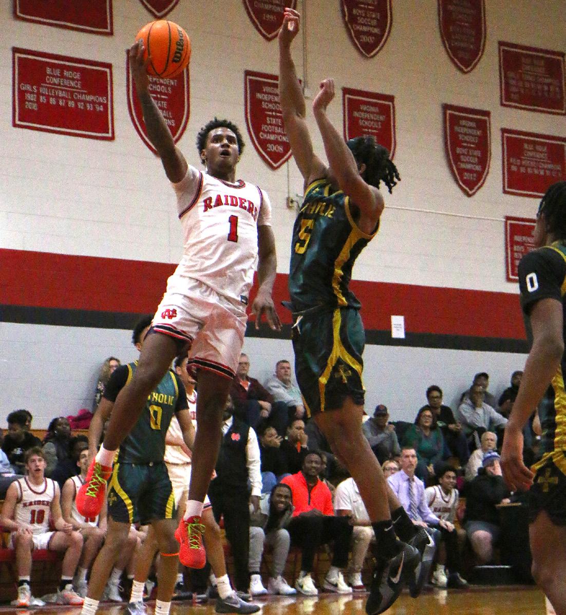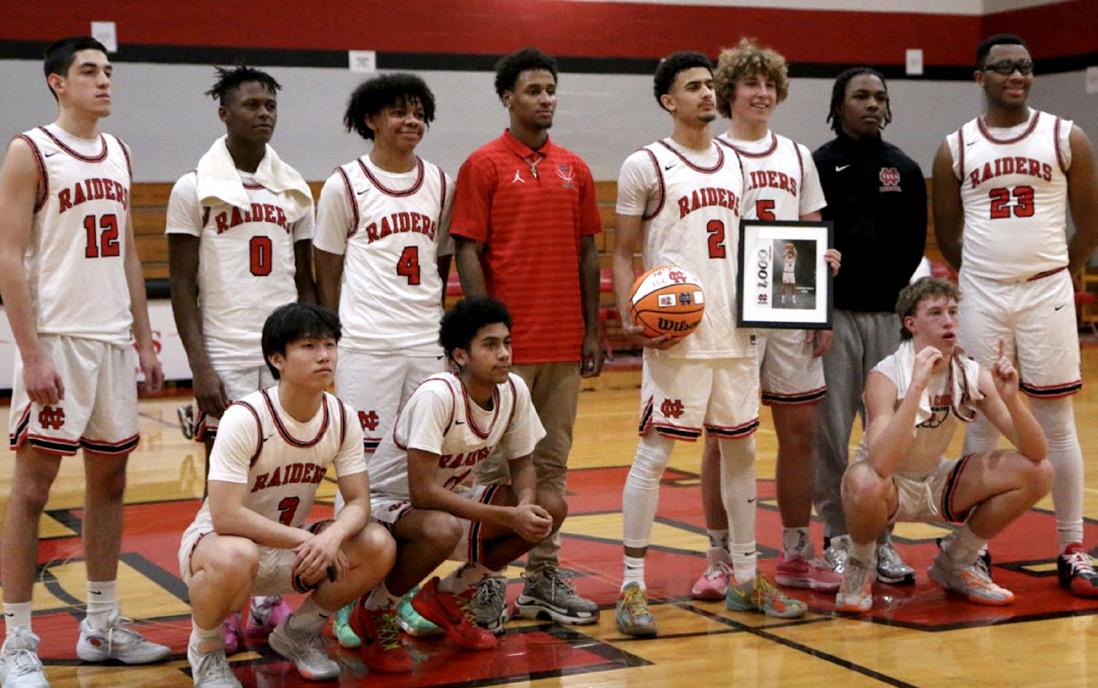 GRAND GAME: Standing with his team, Antonio Mack ‘26 holds his plaque proclaiming his 1000-point career milestone for varsity basketball. The Raiders played Fishburne Military on Jan. 28, dominating the team with a final score of 76-37. With an average of 22 points per game despite missing many games because of an injury, Mack scored his 1000th point of his basketball career before the halftime mark. At one point, Mack intercepted a pass and ended the play with a dunk for two of his 18 points. “I really liked seeing my brother win, and it was a great, energetic moment; to see him grow over the years, to see him get that, it was really a great moment,” said Jesiah Hines ‘27, proudly talking about Mack’s accomplishments. When asked about his feelings at that moment, Mack said, “Obviously it was a great feeling hitting that landmark, but it’s not my end goal,” showing his desire for team over individual achievements. The No. 3 ranked boys will play in the state semifinals today at 5:30 in Richmond. Caption and
