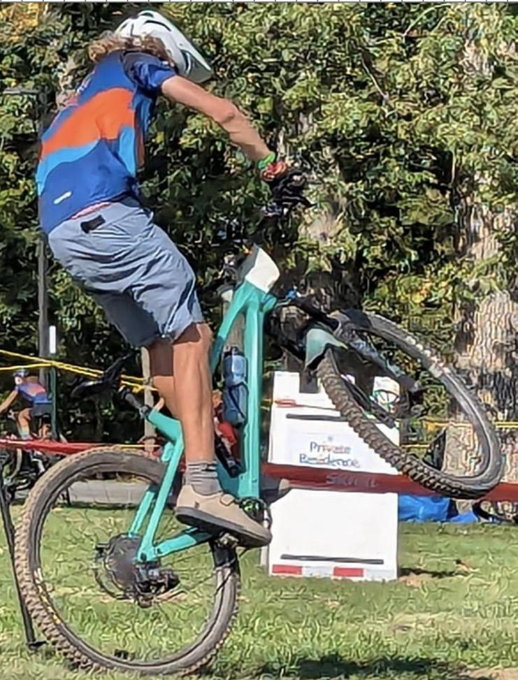 Ryan Arthur ‘28 pops a wheelie to go over an obstacle.