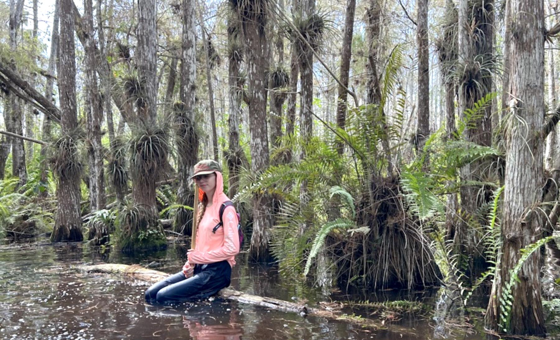 Propped between my walking stick and a floating log, my feet float above the ground as I pose for my mother’s picture. Last year, when this photo was taken, we went to the Everglades for our holiday trip. We camped in the southern most tip of the park and on the third day my mother and I went on a cyprus bog hike. We didn’t see any gators then, but there was one near our campsite, in a rain puddle.