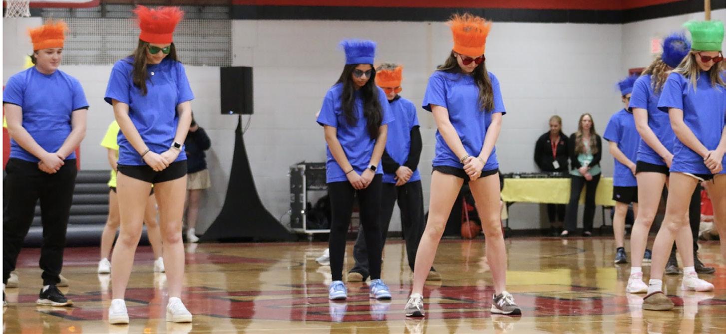 DANCING KILLED MY GRANDMA! OKAY? The sophomore class jams out to songs from the popular movie “Trolls”. The Upper School had been waiting anxiously for the pep rally when each class performed a dance combo for the theme, “At the Movies.” Finley Dalton ‘27 (center with orange wig), Remi Lewis ‘27, Maidah Ahmad ‘27, Dara Kerman ‘27 and Annabell Coles ‘27 choreographed their grade’s dance number and it was clear they put in the work. Everyone on the dance floor was smiling and energized. By the end of their dance, the crowd was on their feet, cheering loudly, appreciating the sophomore’s fun representation of the movie. Caption by Margaret Bass.
