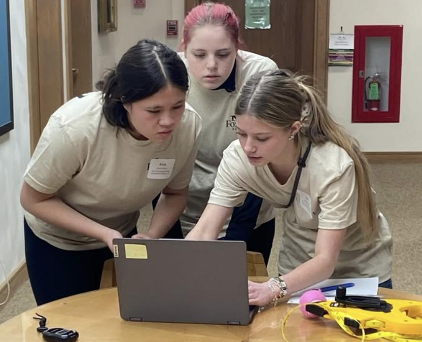 STEAMWORK: Anna Ciccozzi ‘26, Abby Landry ‘26 and Izzy Snyder ‘26 work feverishly to use AI to create solutions to the challenges posed by the orchestrators of event at Foxcroft School on Feb. 22. “I think the competition was really fun,” Ciccozzi said, “I was happy to collaborate with Izzy and Abby, and work on all of the challenges we were given. The math challenge, we had to find a bunch of different sequences and patterns. It was difficult at first, but it was a fun experience trying to solve them. I’m so glad we were able to take home the win.”
