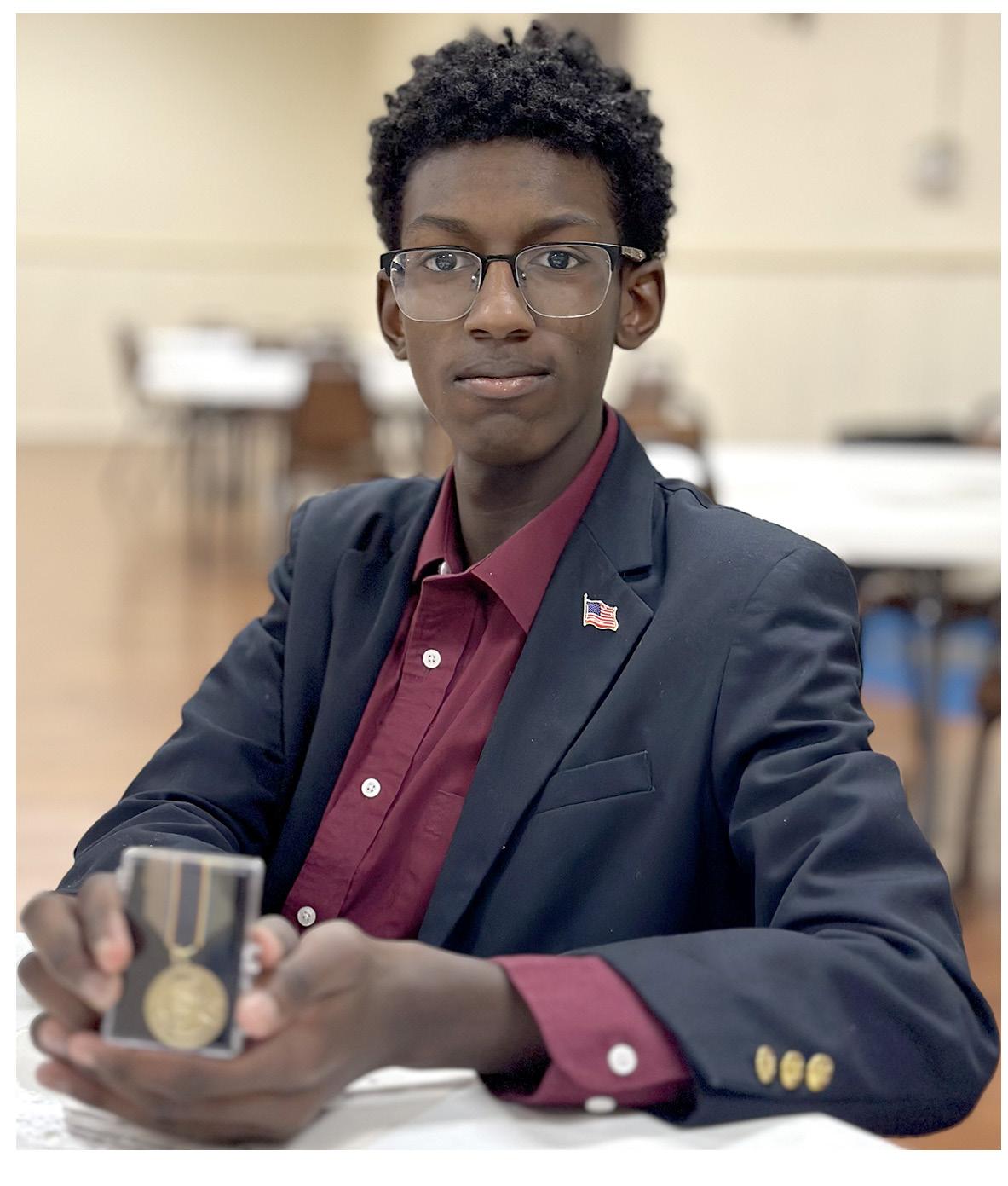 Mason Bibby holds the medal he won for placing first in a recent regional speech and debate contest sponsored by the American Legion. He finished his prepared speech by saying, “I did not engineer these words for the glory of winning a contest or personal pomp and circumstance, they are a benchmark declaration of the values and truths I hold to be “self evident.” His victory earned him a place in the state competition in Virginia Beach starting Feb. 28.