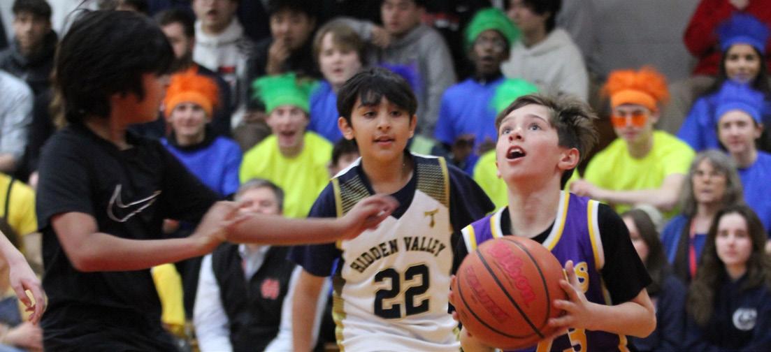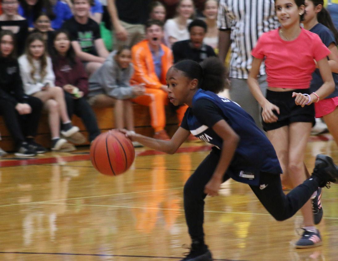 RISING STARS: Brooke Harris ‘32 races down the court to shoot while Jase Rhodes ‘26 and Ryan Thomas ‘26 cheer enthusiastically. Harris had the entire school going wild after making a 3-pointer and was named MVP for the 5th grade girls’ Space Jam Tournament with Remi Lewis ‘27 coaching her. “[My favorite part was] probably when I made the 3-pointer,” Harris said. Braden Perkins ‘32 was MVP for the 5th grade boys’ Space Jam Tournament . He made the first and winning shot under his coach Antonio Mack ‘26. These two 5th grade MVPs may follow in Mack’s footsteps, eventually becoming part of the 1000 point club. Harris photo by Akali Koeda. Perkins photo by Compass staff