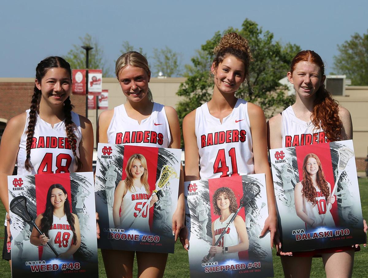Both Raiders and Chiefs teams stood behind Eliza Vogel with blue ribbons tied in their hair to support Morgan’s Message.