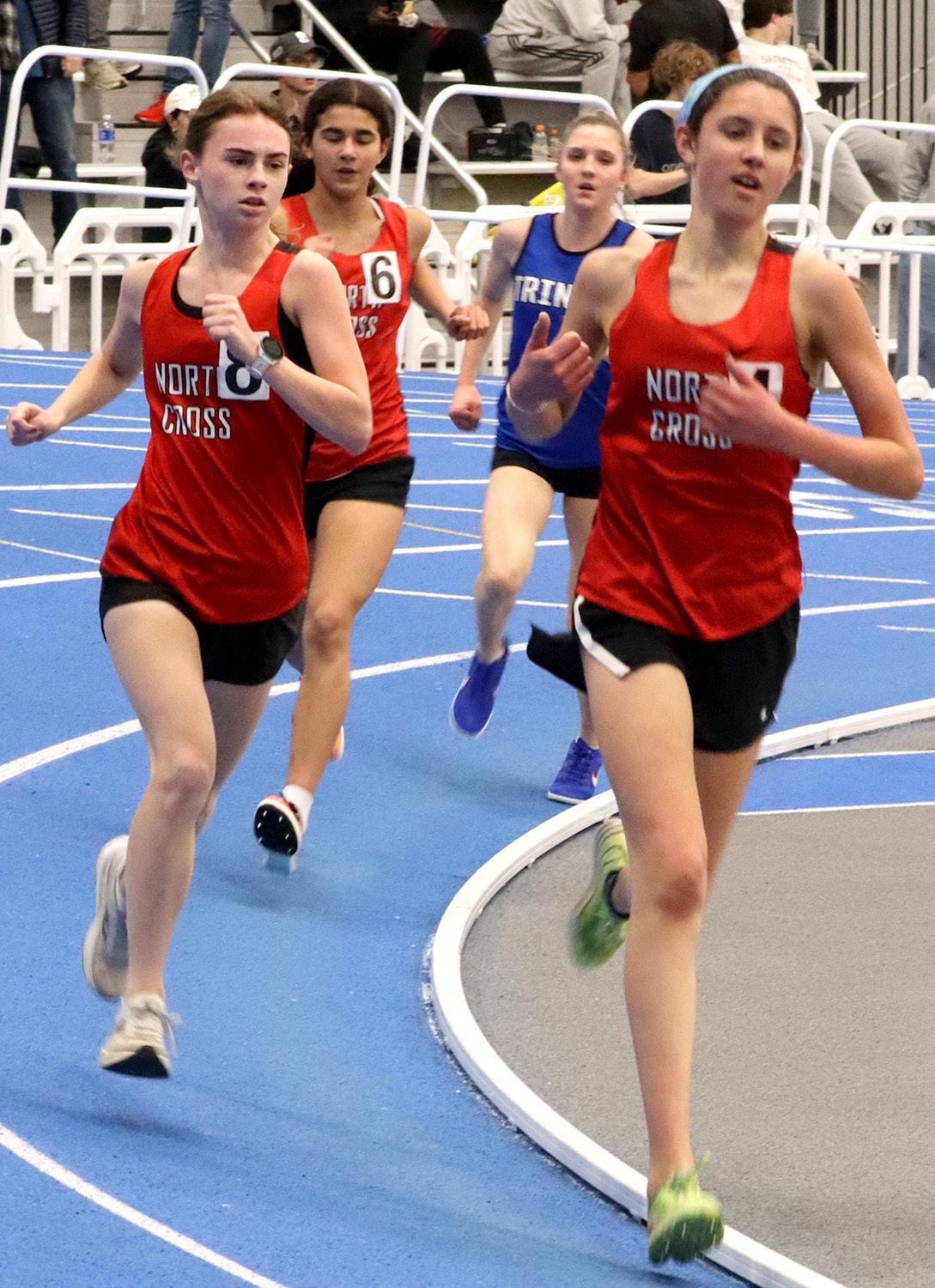 Ainsley Myles ‘27 leads Lillian Phillips ‘29 around the 200-meter track on Feb. 12. Phillips scored 6 points individually in the the 1000 and the 3200 races and 6 more as part of the the girls 4x800 relay. She stated that “My favorite part of running is challenging myself.” Luckily for the team, Phillips has now started prepping for the outdoor track season.. Photo by Elijah Hutcheson
