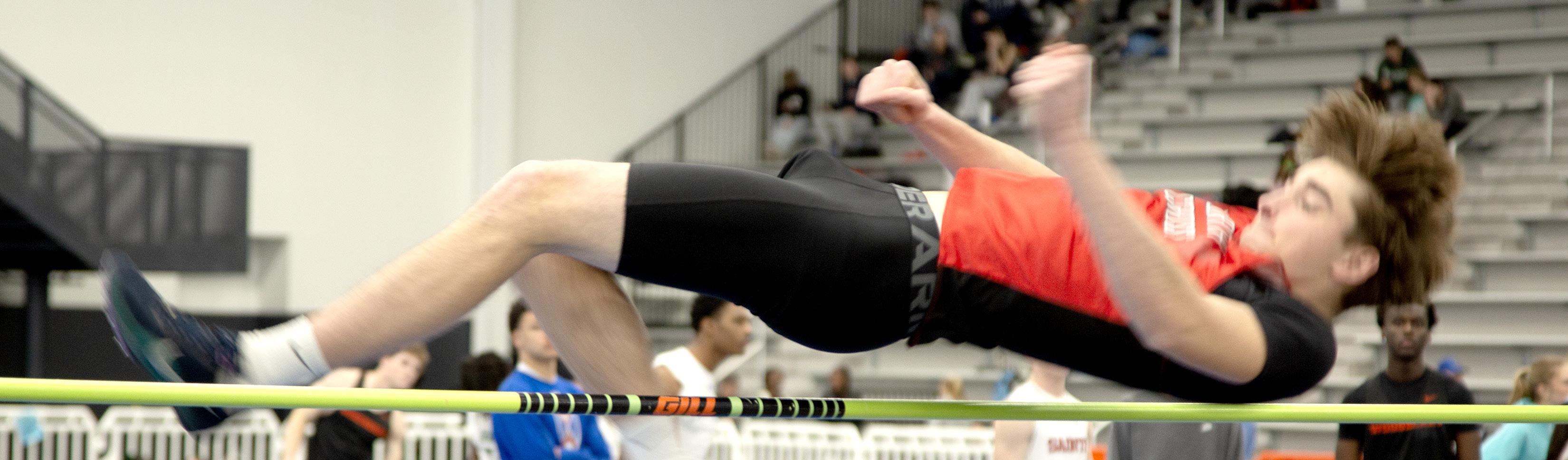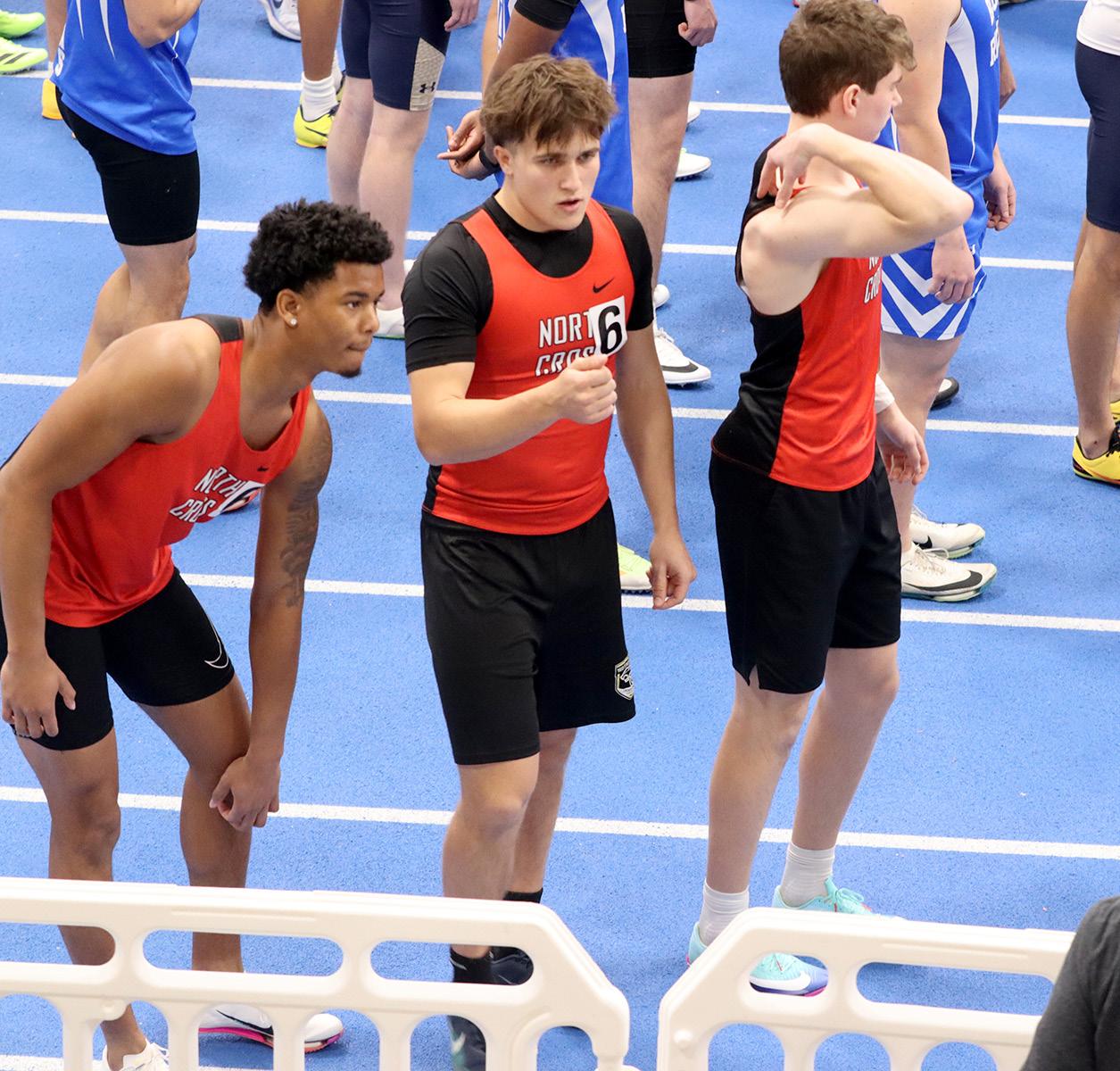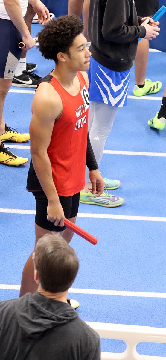 HIGH_JUMPING GERMAN: Sam Bauer ’27 clears the high jump bar at 5’-4”, scoring a nice 4 points for North Cross at the state championship competition and helping them win with 93 points. The German came for football, and then followed many of those players onto the indoor track team.“Winning a state [title] means everything and it’s the result of hard work and dedication and support and excelint [sic] coaching. It’s something I’m very proud of.” When asked about how indoor settings affected his focus, he said, “It is very loud which makes it hard to focus on something but you just have to be locked in.” Now that he has championship rings in both football and indoor track, Bauer will participate in outdoor track and join the lacrosse team that will aim to repeat as state champs. Photo by Andrew Weng
