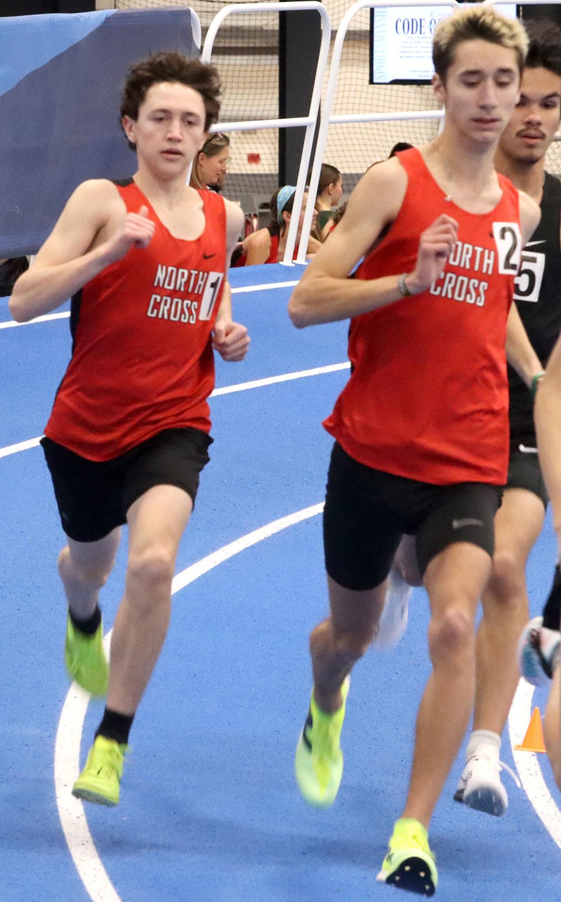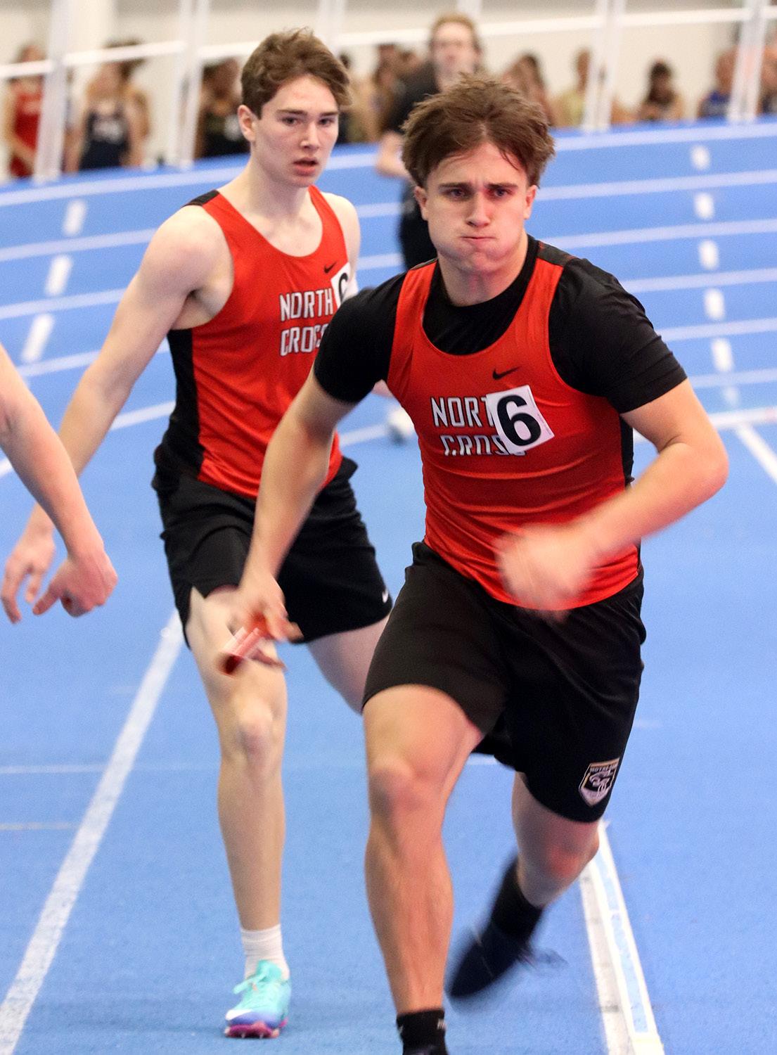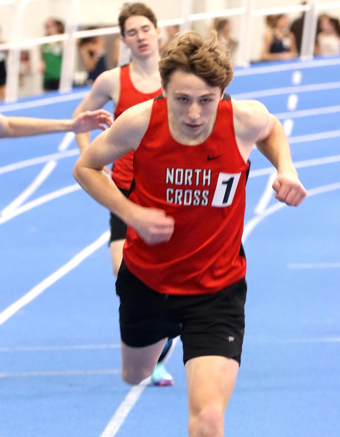 HIGH_JUMPING GERMAN: Sam Bauer ’27 clears the high jump bar at 5’-4”, scoring a nice 4 points for North Cross at the state championship competition and helping them win with 93 points. The German came for football, and then followed many of those players onto the indoor track team.“Winning a state [title] means everything and it’s the result of hard work and dedication and support and excelint [sic] coaching. It’s something I’m very proud of.” When asked about how indoor settings affected his focus, he said, “It is very loud which makes it hard to focus on something but you just have to be locked in.” Now that he has championship rings in both football and indoor track, Bauer will participate in outdoor track and join the lacrosse team that will aim to repeat as state champs. Photo by Andrew Weng