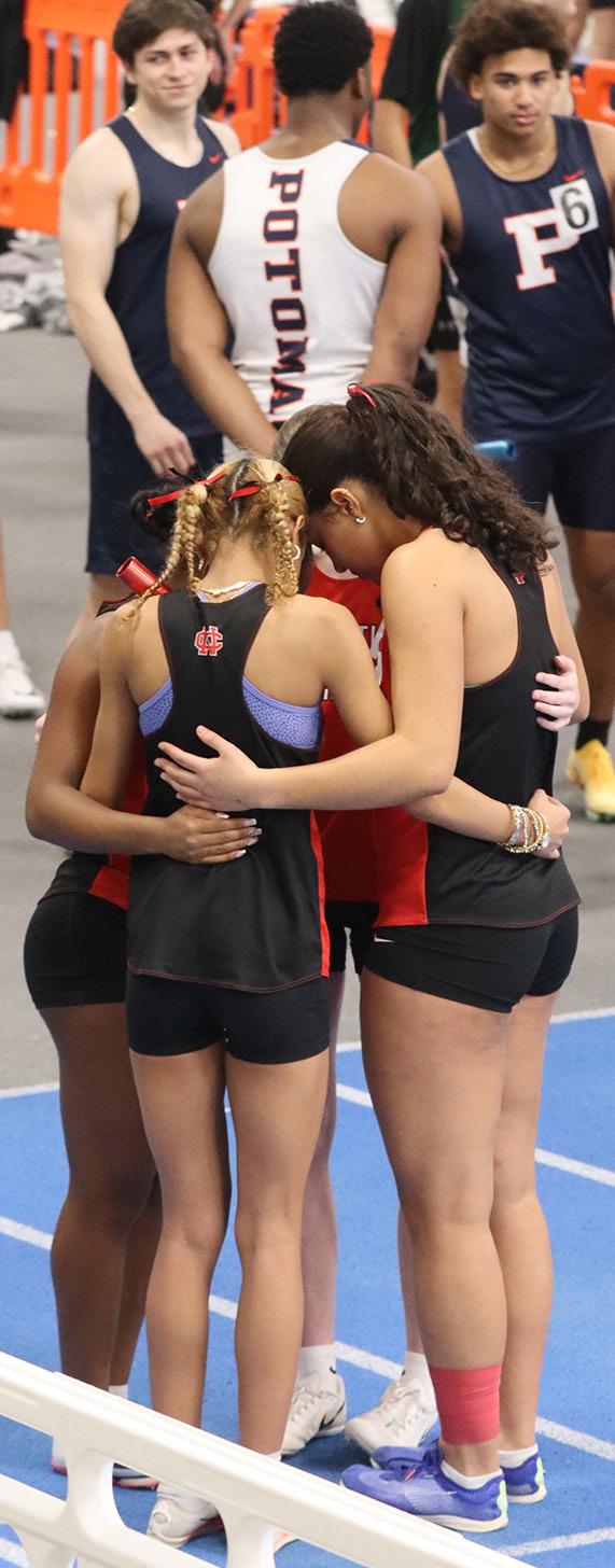 ALL 4 ONE: Before the 4x200 meter relay, the girls pray to get focused, which caught the attention of other athletes. They also enjoyed the atmosphere. Gabby Miller ‘26 led off and handed the baton to Alicia Holmes ‘27, who passed to Camryn Stevens ‘28. Finally, Faith Johnson ‘28 brought the baton home in first place adding 10 points to the team total. Photos by Elijah Hutcheson