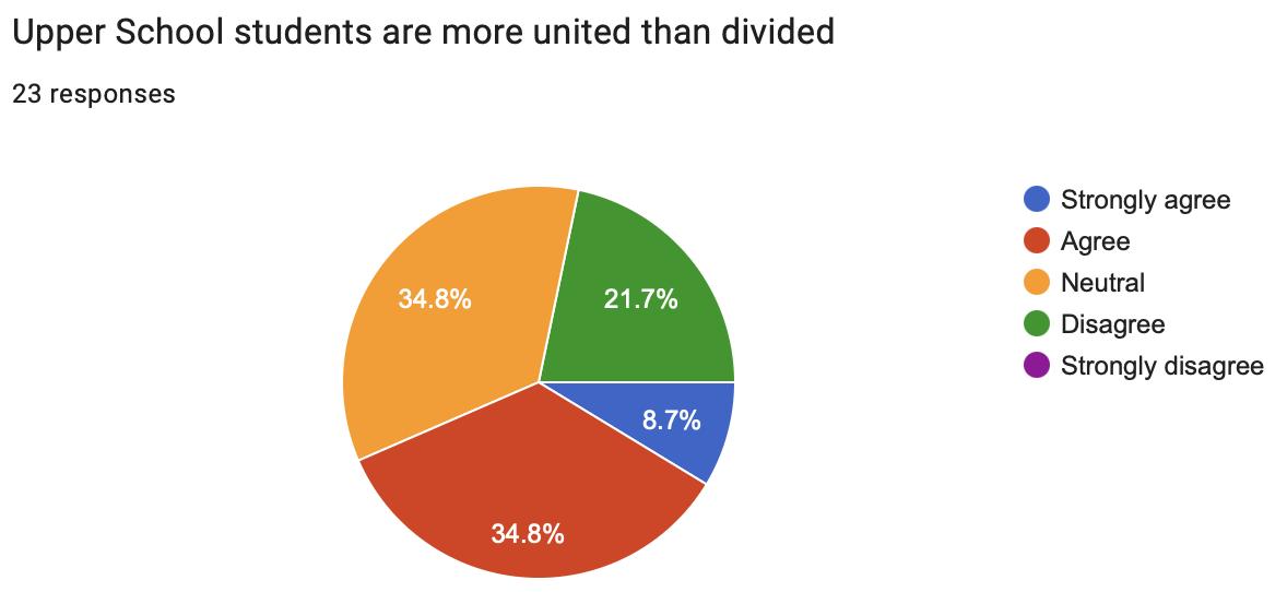 Or, at least, it should be that way. In the same survey, 58 percent of Upper Schoolers don’t feel at least some level of unity with their fellow students. 22.2 percent feel there’s some level of disunity.