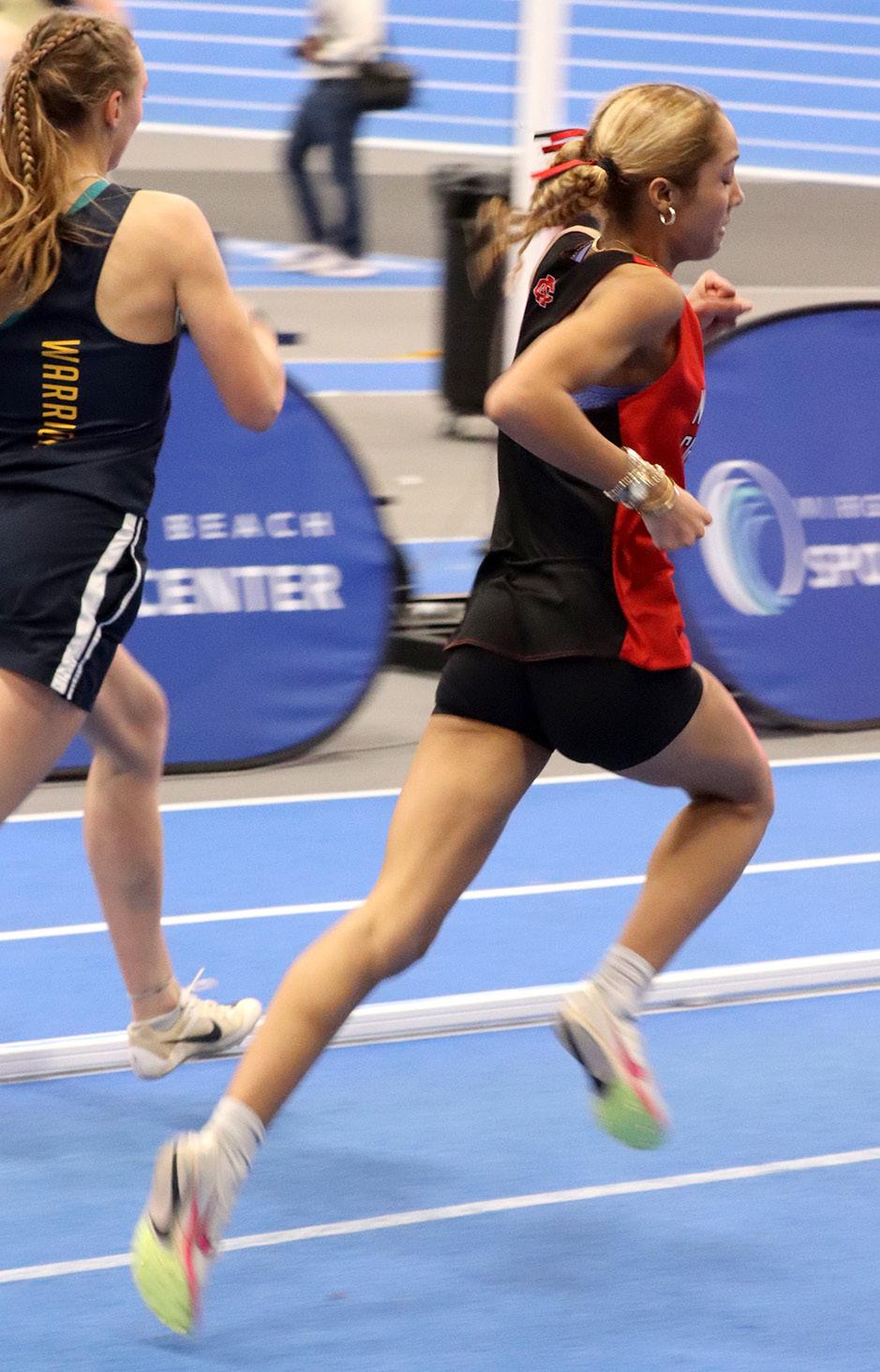 she had not run what she wanted. She was still learning how to run that event, it being her first year running indoor track - so it was a big jump from last year to this year. She ran a 7.91 and placed sixth last year in comparison to her third place finish this year in 7.61.