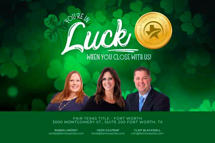 Fort Worth Real Producers • 3 realproducersmag.com We Value Our Partnerships With Real Estate Professionals! When You Partner With Our Team, You & Your Clients Can Expect: • Transparency Throughout The Closing Process • Convenient Closing Options • Industry Information MANSFIELD OFFICE 309 E. Broad St. ARLINGTON OFFICE 1309-A W. Abram We Take Pride In Our Client Centered Approach! YellowstoneNationalTitle.com 817.860.2294