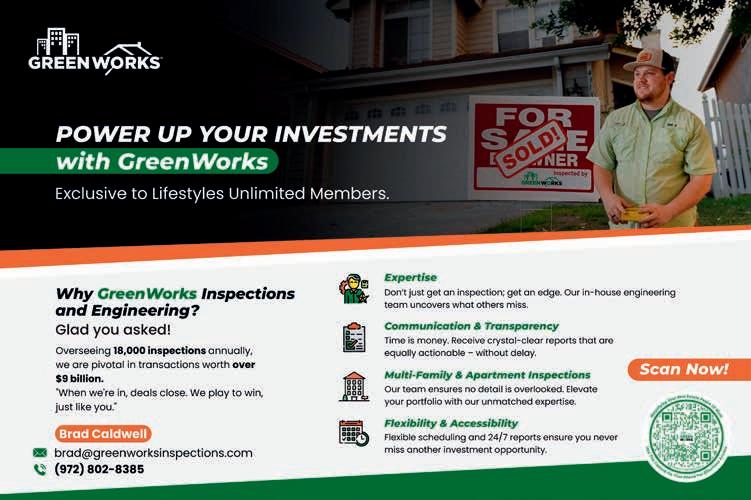 realproducersmag.com Real Producer's Preferred Partner, Kyle Karker 214.801.6555 | AmericanRealPM.com/REALTORS 13747 Montfort Dr, Suite 280 | Dallas, Texas 75240 PARTNER WITH A PROPERTY MANAGEMENT GROUP THAT PUTS OWNING INVESTMENT PROPERTIES Protecting Owners Growing Portfolios Professional Asset Management Scan To Learn Why Every Realtor Needs A Great PM! Referrals & Built-to-LastRelationships ! 100% American Made | 25-Year Warranty | Made from 100% Recycled Plastic | Built to Withstand Any Weather ELEVATE YOUR SERVICE Team Up with Us to Create Outdoor Living Spaces Your Clients Will Love! 682.936.4500 Built-to-Last.com Referrals & Built-to-LastRelationships ! Inspiring conversations with the nation’s top real estate agents. Same Brand, New Reach – Tune in for free today podcast.realproducersmag.com