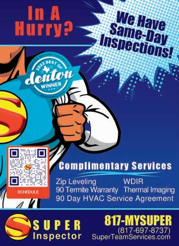 North Fort Worth Real Producers • 67 realproducersmag.com Sewer Scopes • Pre-Listing Inspections • New Construction Inspections • Virtual Inspection Report Delivery • Inspection Report Repair Amendment Builder Tool • WDI • Pool Inspections Foundation Engineering Reports Learn more about us at Inspect360.com or book an inspection at 817-754-0360 and see for yourself. Thorough Home Inspections + Exceptional Service = Happy & Satisfied Clients Thermal Imaging & Zip Level Measurement Included With Every Inspection! Scan To Schedule Today And Take Advantage Of Our Pay At Close Program! Can A Home Inspection Make Your Transaction Go Smoother? YES! With Our New Pay At Close Program Easy-To-Use Repair Amendment Builder Tool 24-Hour Repair Estimate Report $25,000 Of Warranties Included