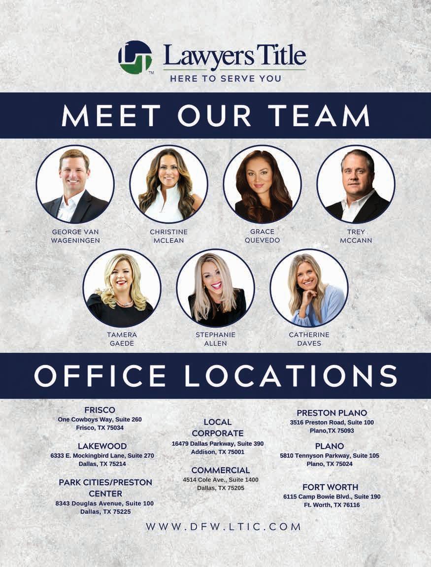 DISCLAIMER: Any articles included in this publication and/or opinions expressed therein do not necessarily reflect the views of The N2 Company d/b/a Real Producers but remain solely those of the author(s). The paid advertisements contained within the Dallas Real Producers magazine are not endorsed or recommended by The N2 Company or the publisher. Therefore, neither The N2 Company nor the publisher may be held liable or responsible for business practices of these companies. If you are interested in contributing or nominating REALTORS® for certain stories, please email us at Jordan.Espeseth@realproducersmag.com
