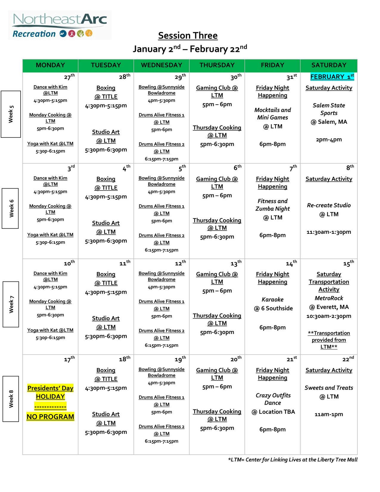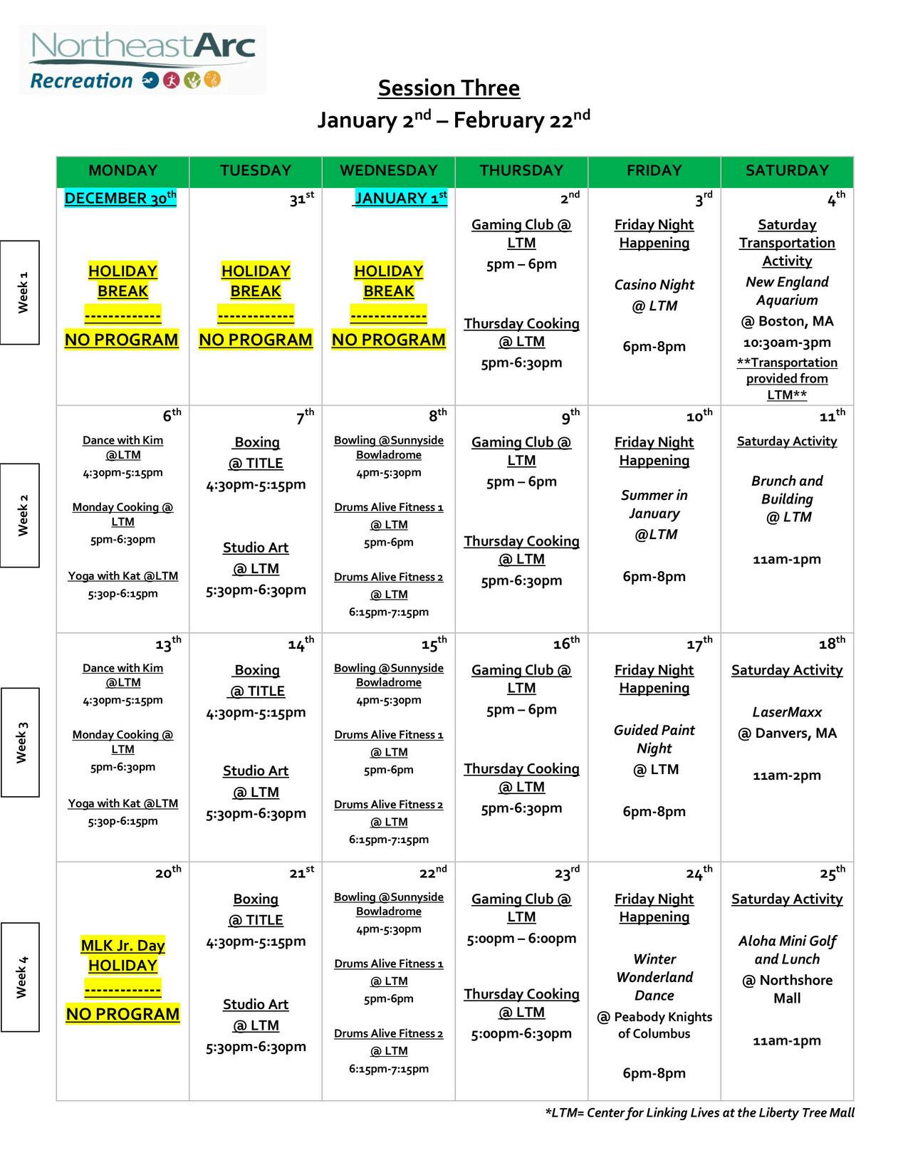 Session 3: January 2nd - February 22nd NortheastArc’sRecreationprogramgivesourclientstheopportunitytoengagewith peers and find events they will enjoy. Although you cannot attend recreation with your clients, this is a great resource to show them and to work on signing up for eventsduringyoursessions. For more info and registration, visit https://tinyurl.com/nearc-rec