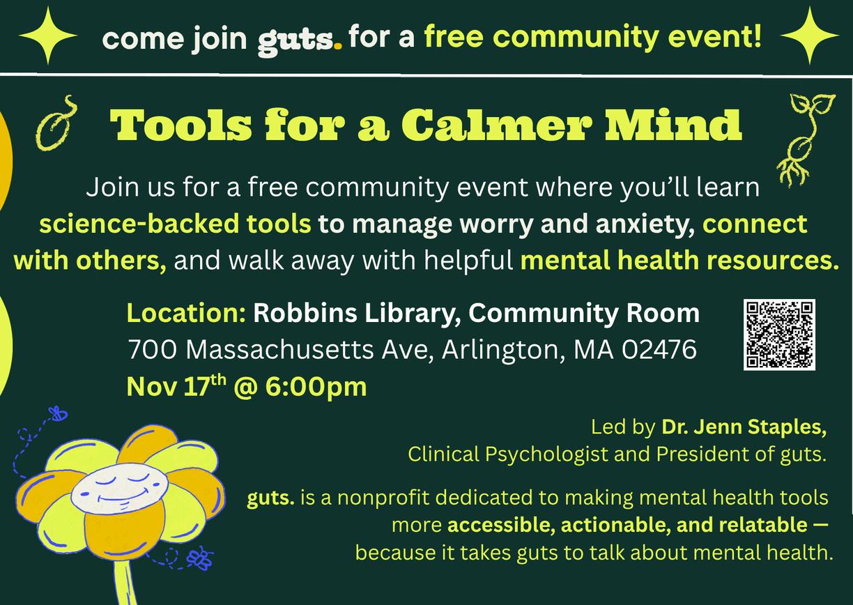 TOOLS FOR A CALMER MIND ROBBINS LIBRARY COMMUNITY ROOM 700 MASS AVE ARLINGTON