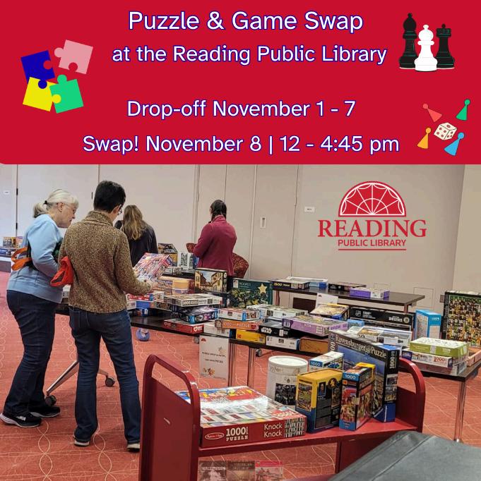 If you love puzzles and games, come to the Reading Public Library to refresh your collection! Trade your old favorites for exciting new ones, where you can snag a free puzzle or game!