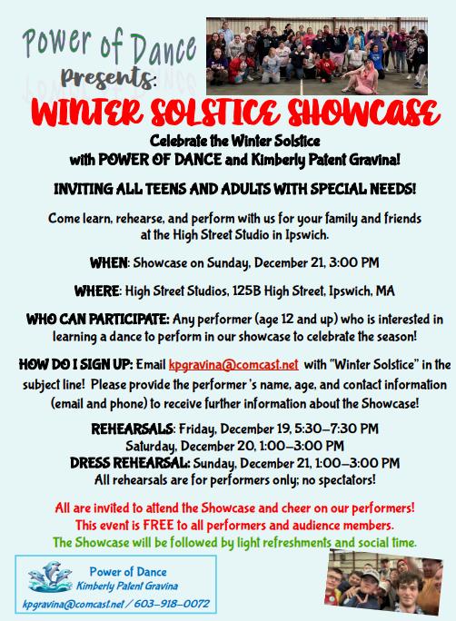 Participants will come to two rehearsals, learn one or two dances, and then perform them in a friendly, supportive, and joyful performance setting. Free for all participants and audience members! After the showcase, we’ll celebrate with light refreshments and time to socialize and enjoy each other’s company.