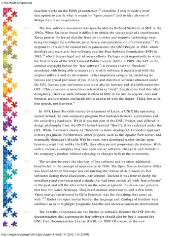 excellent works on the FOSS phenomenon; 12 therefore, I only provide a brief description to clarify what is meant by “open content” and to identify one of Wikipedia’s main inspirations. ¶17