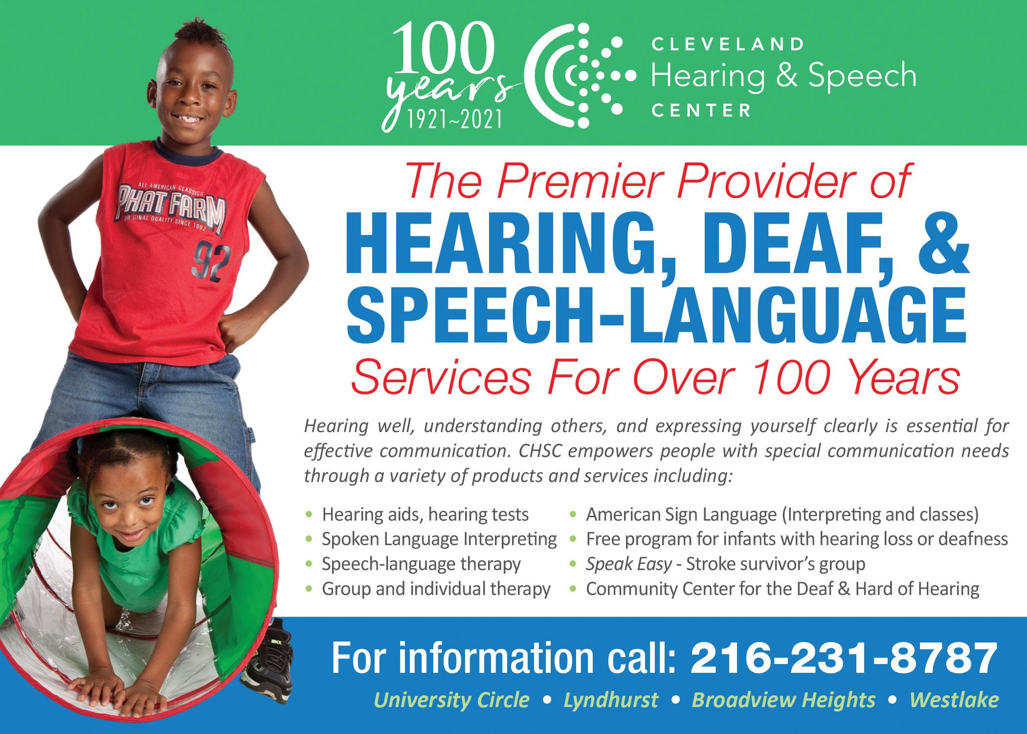 For 100 years, Cleveland Hearing & Speech Center has been the premier provider of programs and services to those who are deaf or hard of hearing, have difficulty speaking, or have other language or literacy delays and disorders. Its vision is a community where every individual communicates effectively. www.chsc.org