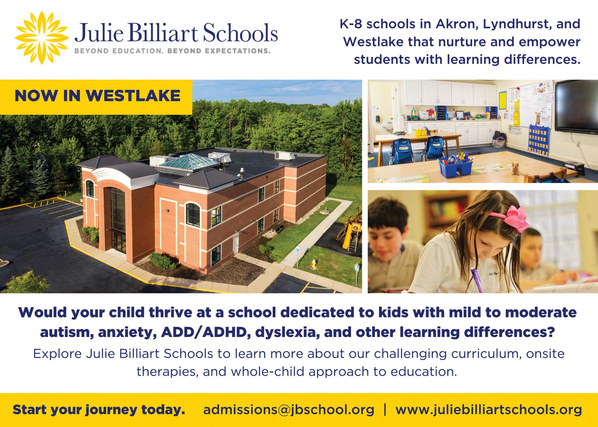 With campuses in Akron, Lyndhurst and Westlake, this network of K-8 private, Catholic schools educate and empower children with learning differences. Students with mild to moderate autism, ADHD, dyslexia, anxiety and other learning differences thrive with JB’s small class sizes, onsite therapies and direct intervention. Visit the website to apply, register for an open house, or learn more. juliebilliartschool.org