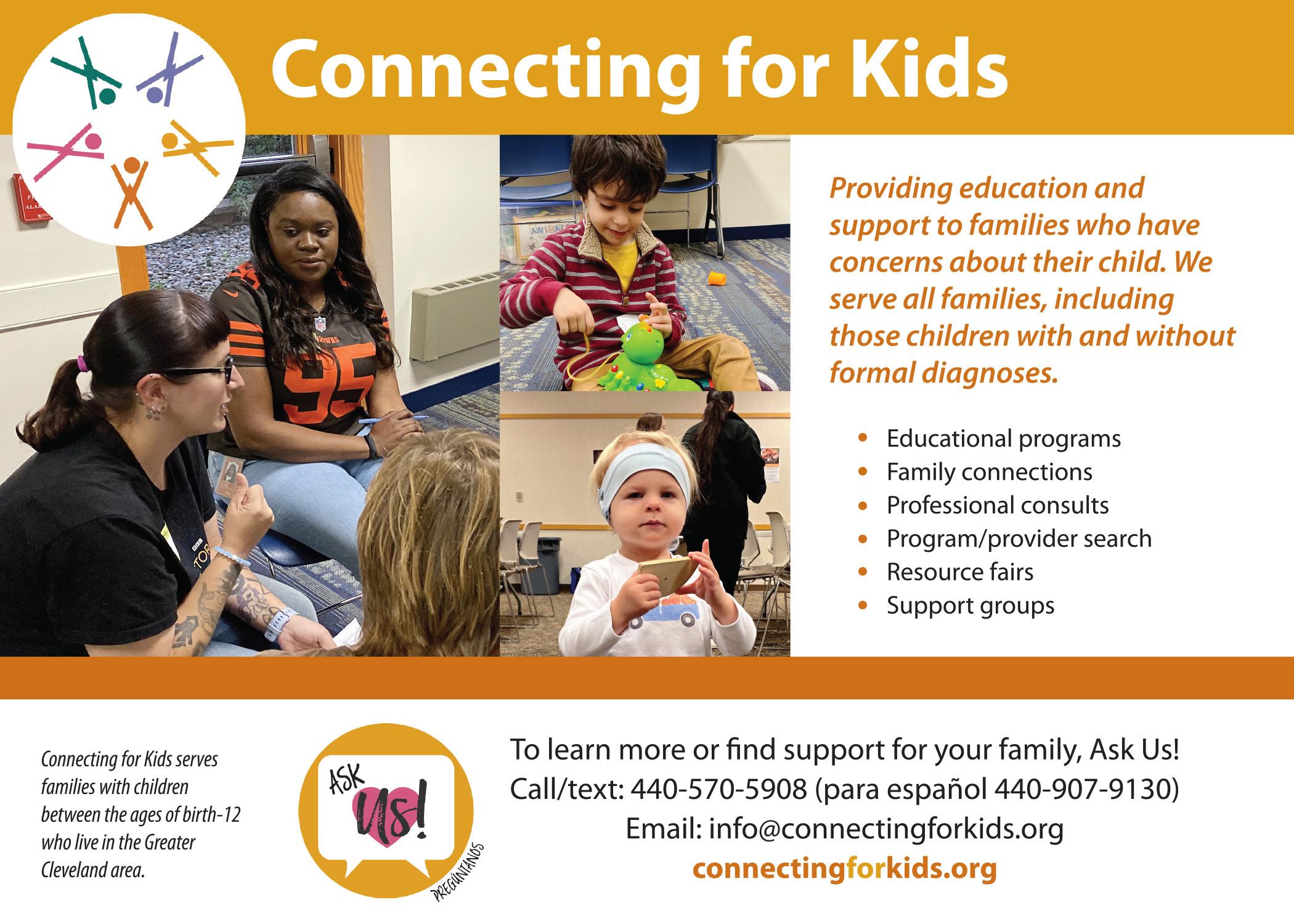 Connecting for Kids provides education and support to families in Cuyahoga, Lorain and surrounding counties who have concerns about their child. It serves all families, including children ages 12 and younger with and without formal diagnoses. CFK offers presentations by professionals and support groups. Its staff works one-on-one as part of the “Ask Us” program to provide local resources and connections to other families. Resources also are available on its website, online service provider directory and fairs. 440-5705908, connectingforkids.org