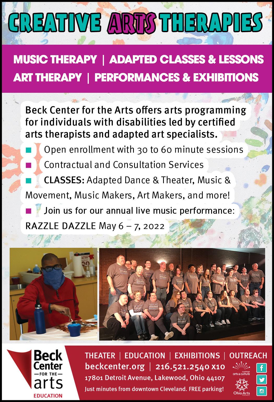 with personally-designed goals tailored to meet their needs. Staffed by board certified arts therapists and professional adapted instructors, Beck Center’s program is the first of its kind in the state of Ohio. 216-521-2540 x34, beckcenter.org