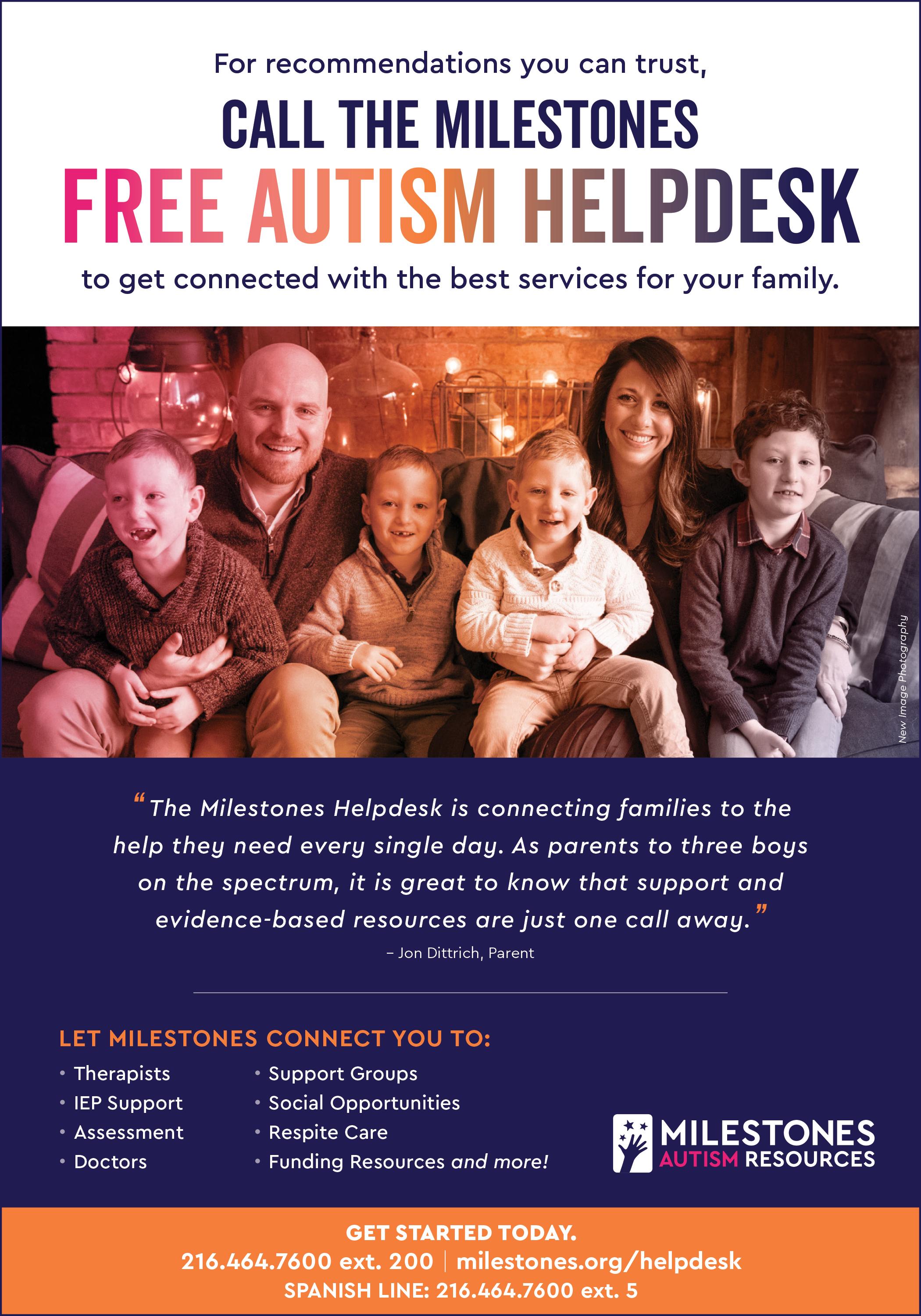 Milestones Autism Resources improves the lives of individuals on the autism spectrum by educating, coaching and connecting the autism community with evidence-based information. Providing an annual autism conference, a free helpdesk, consultations and training, and a website with more than 1,400 resources, Milestones is here to support individuals at every age, stage and ability. For more information, visit milestones.org or call the autism helpdesk at 216-464-7600 ext. 200. To connect with a Spanish speaker, call 216-464-7600 ext. 5.