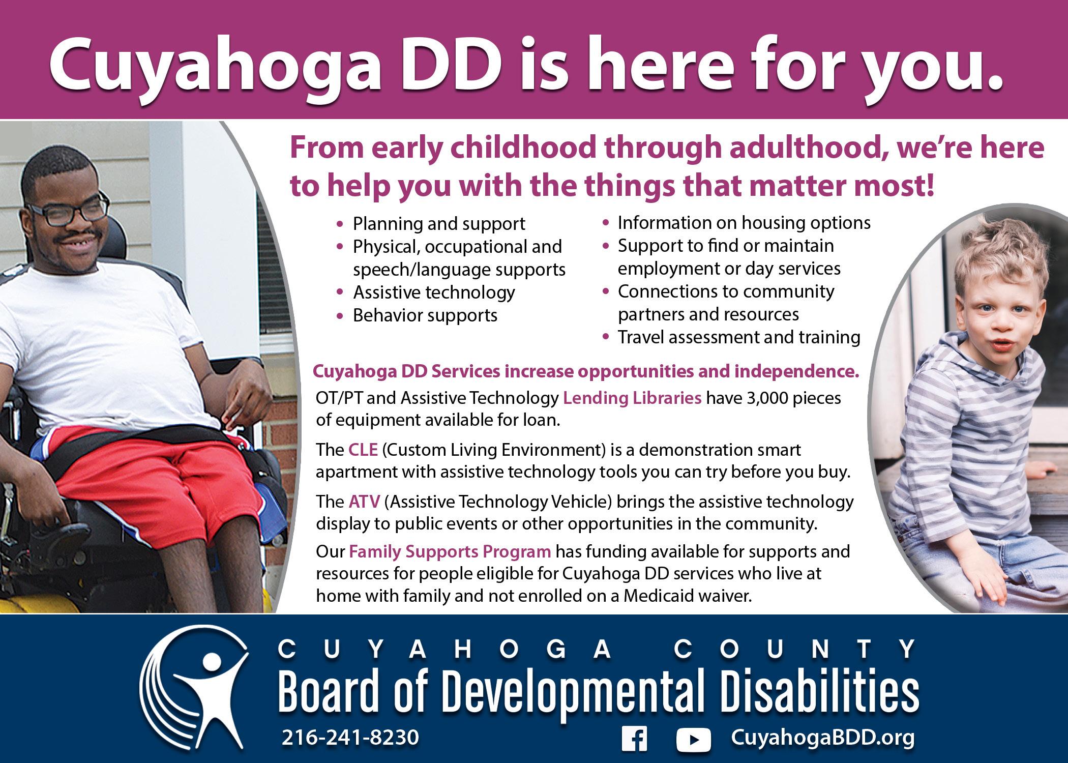 The Cuyahoga County Board of Developmental Disabilities proudly supports and empowers people with developmental disabilities of all ages to live, learn, work and play in the community. For more information on services and resources, call 216-241-8230 or visit cuyahogabdd.org