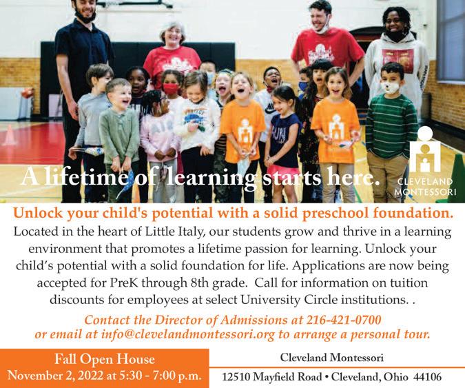 Cleveland Montessori has been serving the Little Italy and Greater Cleveland Community for over 25 years, providing an education for life, which celebrates diversity, growth and joy. Students from preschool through eighth grade are met with respect and compassion as they strive to meet their individual potential in beautifully prepared classrooms that offer social, emotional and academic experiences in a unique urban setting. Apply now for 2023-24. 216-421-0700, info@ clevelandmontessori.org, clevelandmontessori.org