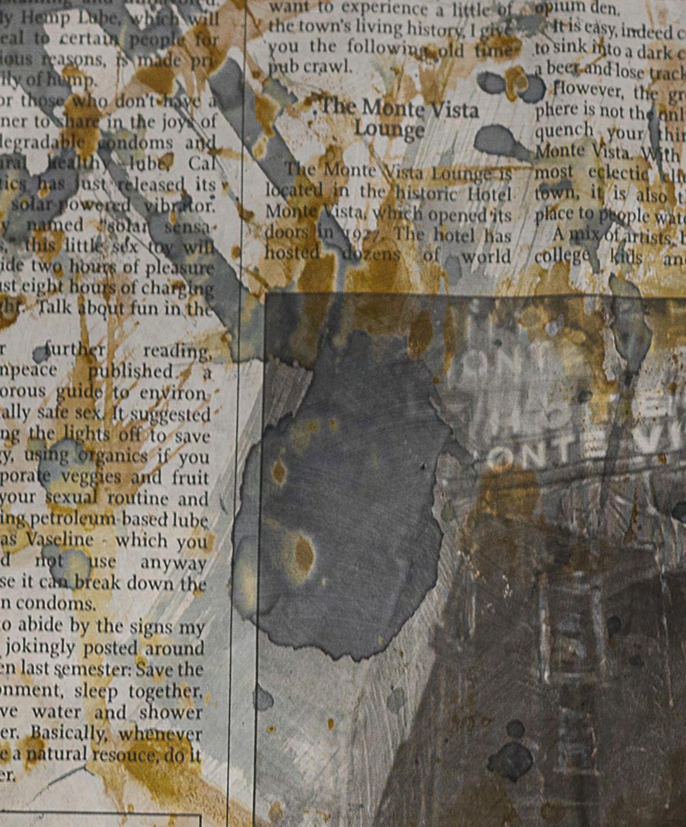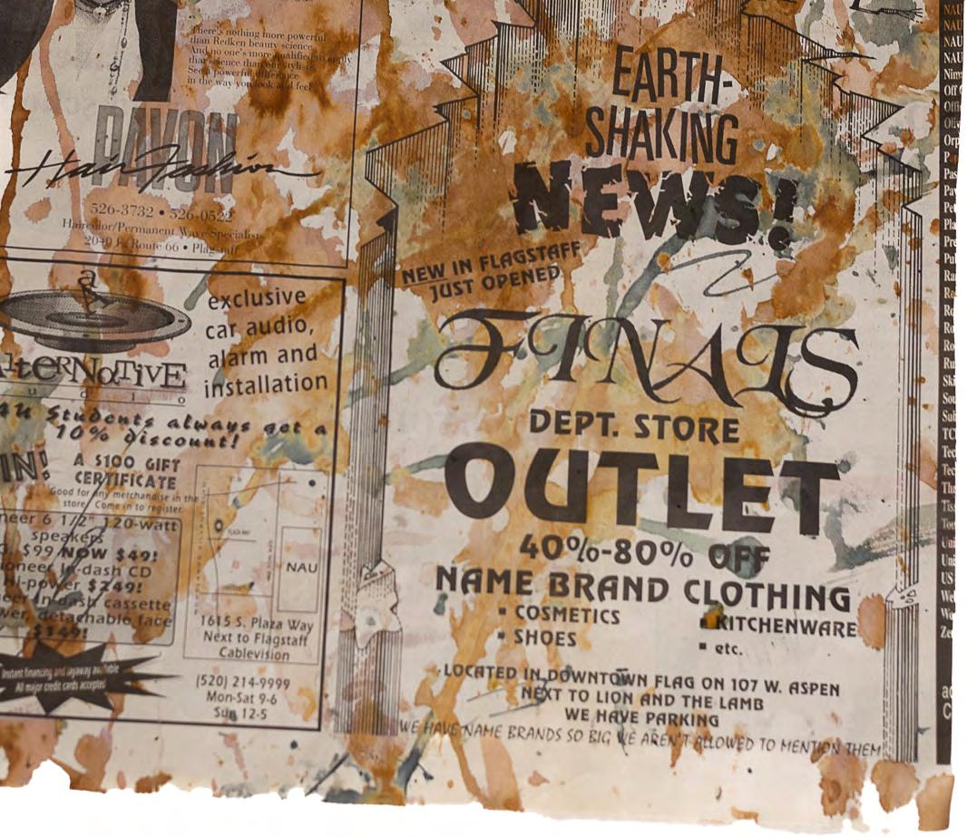 One Feb. 18, 2004 issue of The Lumberjack splattered with cyanotype and Van Dyke brown chemicals