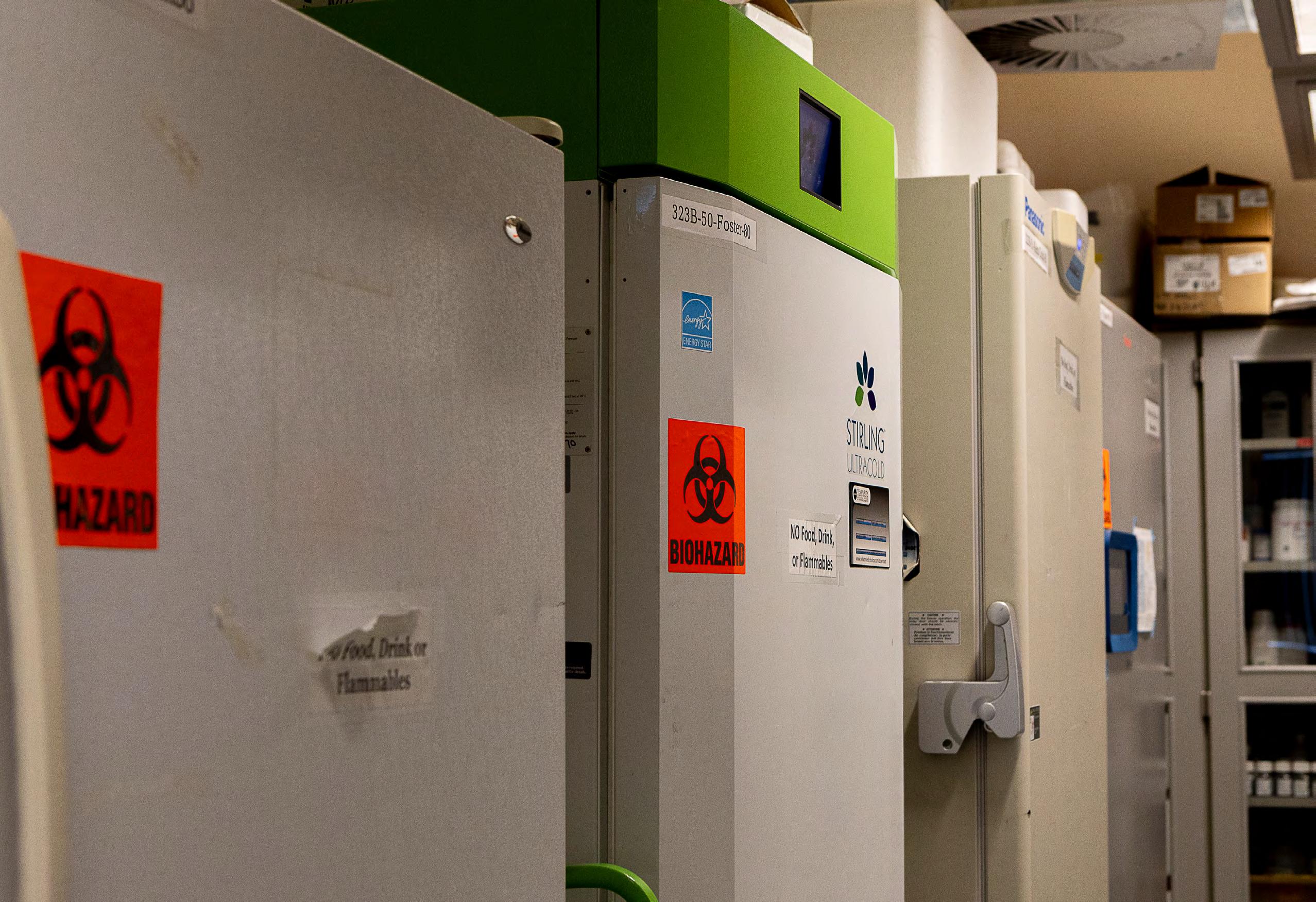 A refrigerator with a biohazard sign on it contains samples from experiments inside the Applied Research and Development building. Sierra Schafer
