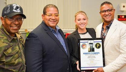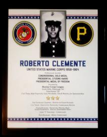 Clemente was honored on October 5 by The Veterans Channel and The American Legion United States Marine Corps Post 726 from Bethel Park. Clemente’s sons Luiz and Roberto Jr. were on hand as their late father was honored for his military service. Joe Billetdeaux, director of Alumni Affairs, Promotions, and Licensing for the Pittsburgh Pirates, helped coordinate the presentation. Also on hand were Carl Truss and Lexi Kamphaus of the Veterans Channel, who served as co-presenters of the award. Master Sergeant Chuck Burrow and members of Pittsburgh’s American Legion USMC South Hills Detachment 726 from Bethel Park also served as presenters.