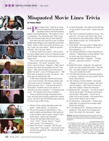 5. In Field of Dreams – the quote in the film was, “If you build it, he will come.” What’s the misquote? 6. This actor is famously quoted as saying, “You dirty rat!” He never says that in any movie. The closest he came was saying, “Mmm, that dirty, double-crossin’ rat,” in the 1931 film Blonde Crazy. 7. Snow White – the real quote is “Magic Mirror on the Wall, who is the fairest one of all?” The misquote is___? 8. This famous detective is often misquoted as uttering – “Elementary, my dear Watson,” but he never says this in books or films. 9. Gone with the Wind – misquote - “Frankly Scarlett, I don’t give a damn!” It should be____. 10. Name this movie – misquote “You want the truth? You can’t handle the truth!” The real line “You want answers? I want the truth.” “You can’t handle the truth!” 11. This 1931 Dracula actor is frequently quoted as saying, “I want to suck your blood,” but he never uses that line. 12. The Treasure of Sierra Madre – real quote -“Badges? We ain’t got no badges. We don’t need no badges. I don’t have to show you any stink’ badges.” Name the misquote – 13. Name the film – misquote – “I’m out of order? You’re out of order! This whole courtroom’s out of order! Real quote – “You’re out of order! You’re out of order! The whole trial is out of order! They’re out of order!” 14. All About Eve – actual quote – “Fasten your seats belts. It’s going to be a bumpy night.” Name the misquote. 15. In The Wizard of Oz – Dorothy is often misquoted as “Toto, we’re not in Kansas anymore,” but what’s the real quote? l l l Sources: http://www.filmsite.org/moments0.html, listverse. com/2007/10/18/top-15-film/misquotes, buzzfeed.com, http:// whatculture.com/film/30-iconic-movie-lines-that-are-alwaysmisquoted Answers: 1. “Good evening, Clarice.” 2. “Greed is good.” 3. “Me Tarzan, You Jane.” 4. Dirty Harry 5. “If you build it, they will come.” 6. James Cagney 7. “Mirror, mirror on the wall, who is the fairest of them all?” 8. Sherlock Holmes 9. “Frankly my dear, I don’t give a damn!” 10. A Few Good Men 11. Bela Lugoisi 12. “Badges? We don’t need no stinkin’ badges!” 13. And Justice for All 14. “Fasten your seat belts, it’s going to be a bumpy ride.” 15. “Toto, I’ve have a feeling we’re not in Kansas anymore!”