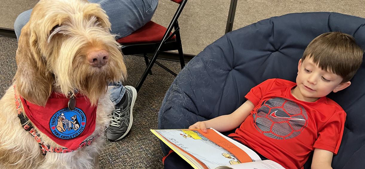 Cranberry Public Library’s “Tail Waggin’ Tutors” programs lets elementaryaged kids practice reading to dogs.