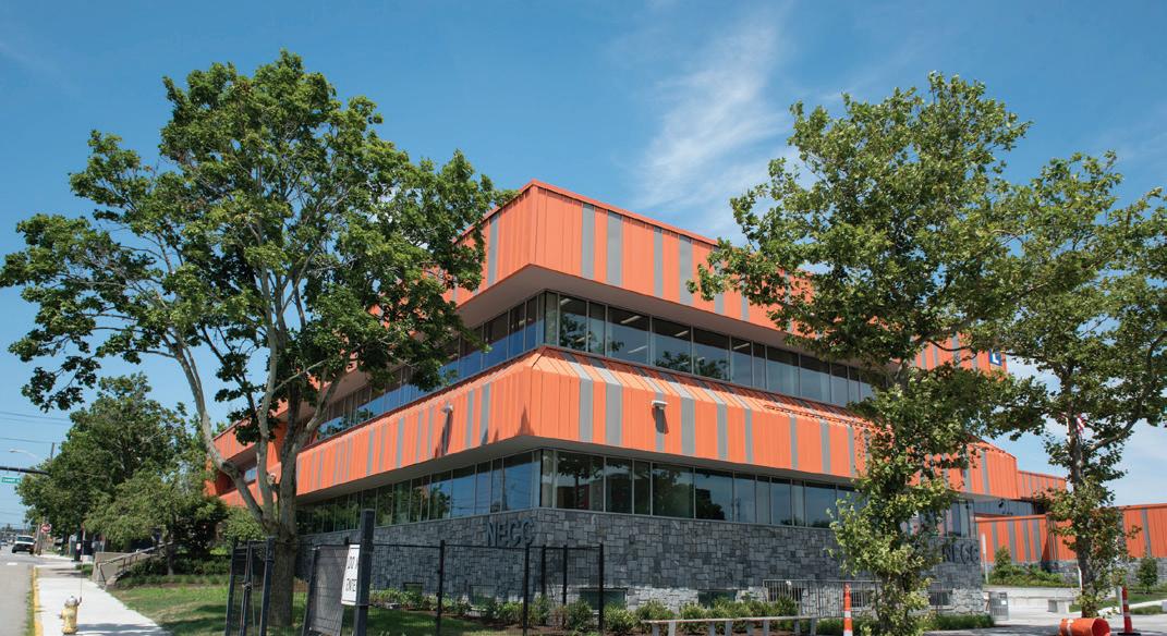 The renovated space features new windows; new terra cotta hued siding that complements the college’s Dr. Ibrahim El-Hefni Allied Health & Technology Center and 420 Common St. facades; an improved parking lot; and fresh landscaping.