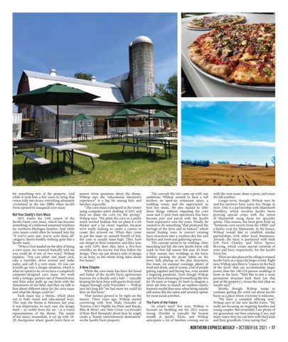 answer trivia questions about the theme. Witkop says the “educational interactive experience” is a big hit among kids and families, especially. “The corn maze is designed in the winter using computer-aided drafting (CAD) and then we plant the corn [in the spring],” Witkop says. “We plant the corn in a pretty much normal fashion, but we plant it a lot thicker and a lot closer together, because we’re really looking to create a canvas to create this artwork on. When they come to put the maze in, around Fourth of July, the corn is usually knee-high. They have our design in their computer, and they sync up with GPS; then they have a five-foot rototiller on the tractor and they follow the design. They can put about a mile of design in an hour, so the whole thing takes about five hours.” A New Chapter While the corn maze has been the bread and butter of the Jacob’s Farm agritourism business for a decade and a half — typically keeping the farm busy with guests from midAugust through early November — Witkop says he’s long felt “we had more we could do here on this farm.” That instinct proved to be right on the money. Three years ago, Witkop started conversing with Troy Daily (founder of Traverse City’s Paddle for Pints and Kayak, Bike & Brew) and Nate Crane (co-founder of Rare Bird Brewpub) about how he might create a “family entertainment destination” on the Jacob’s Farm property.