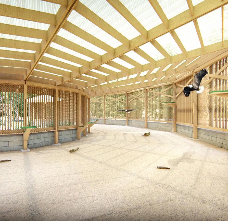 Outdoor enclosures that allow for rehabilitation and conditioning will also be included, as well as a 100-foot curved aviary for raptors that can’t be released back into the wild. Made of locally harvested timber, this structure will provide a home for birds that are permanently mentally or physically disabled.