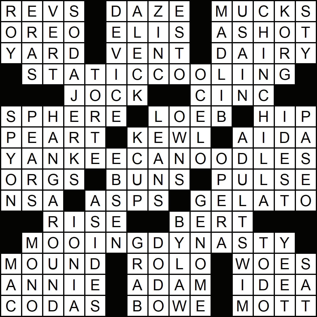 1. New England soccer squad, for short 5. Astound 9. Messes (up) 14. Cookie that puts filling inside wafers 15. New Haven collegians 16. "Take ___ at it" 17. Sale spot 18. Ductwork opening 19. Dietary no-no for some 20. Air conditioning that doesn't move? 23. One of the "Breakfast Club" archetypes 24. Abbr. for the president 25. Simple solid figure 28. "Stay (I Missed You)" singer Lisa 30. Pants pocket locale 33. Rush drummer Neil 34. "Awesome," online 35. Verdi's classic 38-Down 36. New York baseball player publicly displays affection? 39. Charitable gps. 40. They're specialized for Big Macs 41. Rhythmic beat 42. Super-secret intelligence gp. 43. "Antony and Cleopatra" creatures 44. Talenti product 45. Get up 47. Muppet oatmeal lover 48. Ruling family full of cows? 53. Diamond center 54. Candy in a cylinder 55. Serious troubles 57. Lennox of the Eurythmics 58. Singer Levine in a recent texting scandal 59. Scheme 60. Concluding passages 61. Ex-heavyweight champ Riddick 62. "All the Young Dudes" group ___ the Hoople DOWN 1. "Succession" surname 2. Periods of distinction 3. Skateboarding version in the X Games, but not the Olympics 4. Fountain workers in the 1950s 5. Smartphone, e.g. 6. Smart one? 7. Sunscreen element 8. "___ Perpetua" (Idaho motto) 9. Fill-in-the-blanks story 10. Bolt like lightning? 11. Furry South American rodent 12. Japanese synthesizer brand since the 1960s 13. Porcine pen 21. Austrian cake 22. Kitchen sponge brand 25. Observe with secret cameras, perhaps 26. Fruit cocktail ingredients 27. Linger 28. Has a tendency 29. Has the deed to 31. "That is," classically 32. 1990s Toyota model 34. Keurig pod 35. Late-night Cartoon Network programming 37. "The Beverly Hillbillies" actor 38. "Antony and Cleopatra," e.g. 43. Private lines 44. What 2022 Nobel Prize winner Svante P‰‰bo has worked on mapping for Neanderthal Man 46. Ancient region of Turkey for which a sea is named 47. Club regulation 48. Bi-, bifurcated 49. Capture the attention of 50. Pigeon's extinct cousin 51. List header 52. Chuck with force 53. Cheese partner 56. It peaks at 1600, for short "Round and Round" this counts double. by Matt Jones