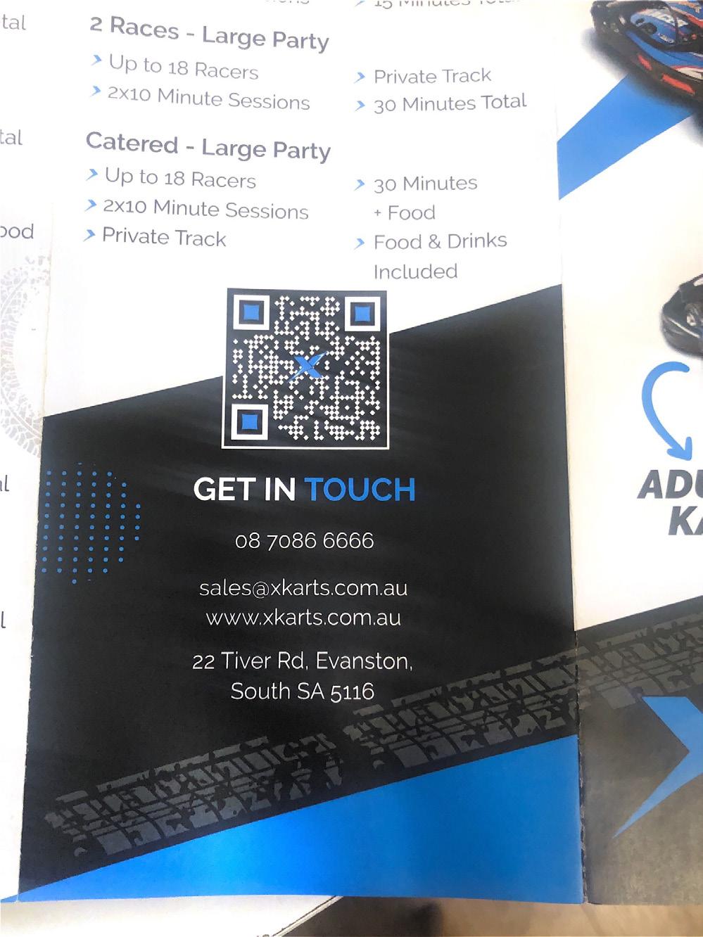 JUNIOR KARTS ADULT KARTS GET IN TOUCH 7086 6666 www. xkarts .com.au sales@xkarts.com.au 22 Tiver Road, Evanston South SA 5116 CORPORATE EVENTS PARTY PACKAGES ARRIVE & DRIVE SCHOOL HOLIDAY FAMILY KARTING FROM 8 YEARS OLD M