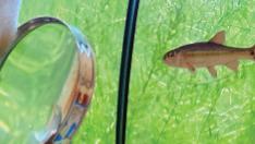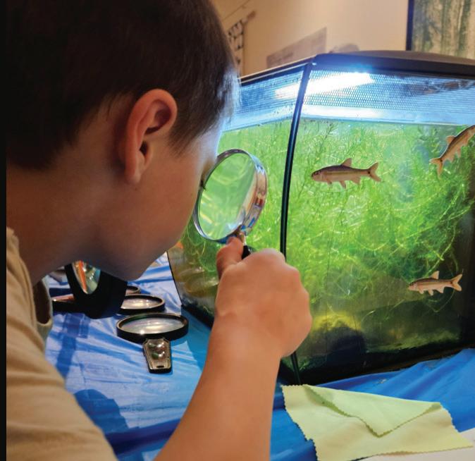 Left - Riley Rivey takes a closer look at a tank of plants and water, taken from Charlie Lake.