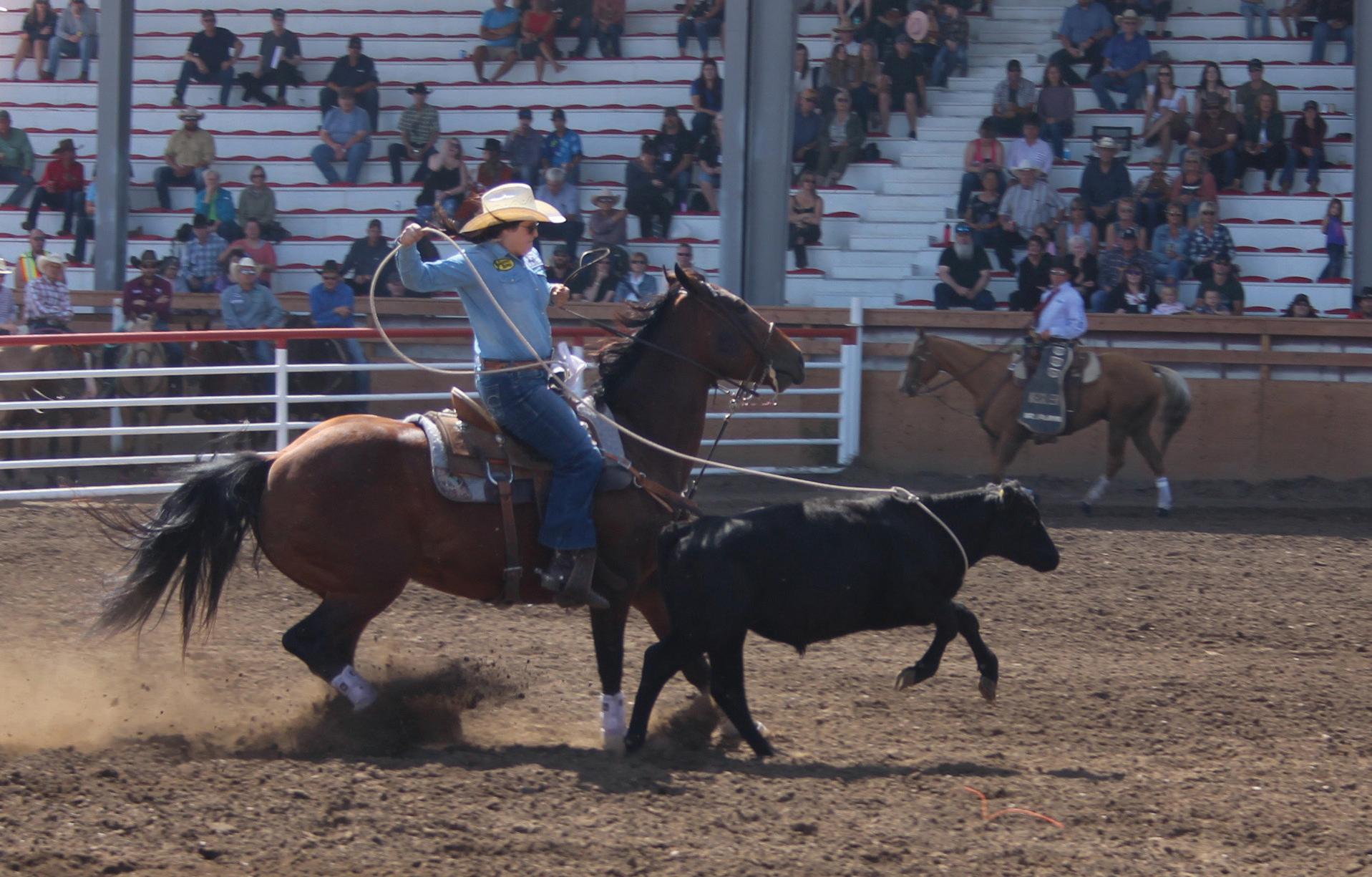 Pink Mountain’s Fallyn Mills ropes a calf last week at the Dawson Creek Exhibition and Stampede. BROWN