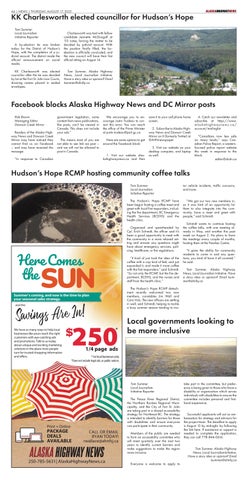 ARTS • A5 WEAVE IT UP COLOURS OF THE PEACE CITY • A3 ROAD WORK 100th STREET MILLING CONTINUES NEWS • A6 INCLUSIVITY GOV’T LOOKS TO BE MORE INCLUSIVE ARTS • A8 OKER! WE CAUGHT HIM IN DAWSON CREEK WhenYouAreOut intheField, TimeISMoney. QUALITYPARTS, EXPERTSERVICE! HoursMon-Fri: 8am-5pm Sat: 8am-Noon 9224100Street, FortSt.John,BC (250)785-0463 AfterHours-LeaveMessage RipsShoeRenu.comripsshoerenu@shaw.ca DawsonCo-opMall•Phone:250-782-8283 Hours:Monday-Friday:8:30AM-5:00PM Saturday&SundayCLOSED SANDALS•SHOES•BOOTS INTHEPEACERIVERAREA Presentsthe People’sChoiceAwards WhowillbeVotedFavouritePerson,PlaceorBusiness? Fillouttheforminthisweek’seditionanddropitoffatouroffice, oronlineatalaskahighwaynews.ca/contests/peoples-choice 9916-98thSt.,FortSt.John•Phone: 250-785-5631 ScanHere toVote! Scan Here