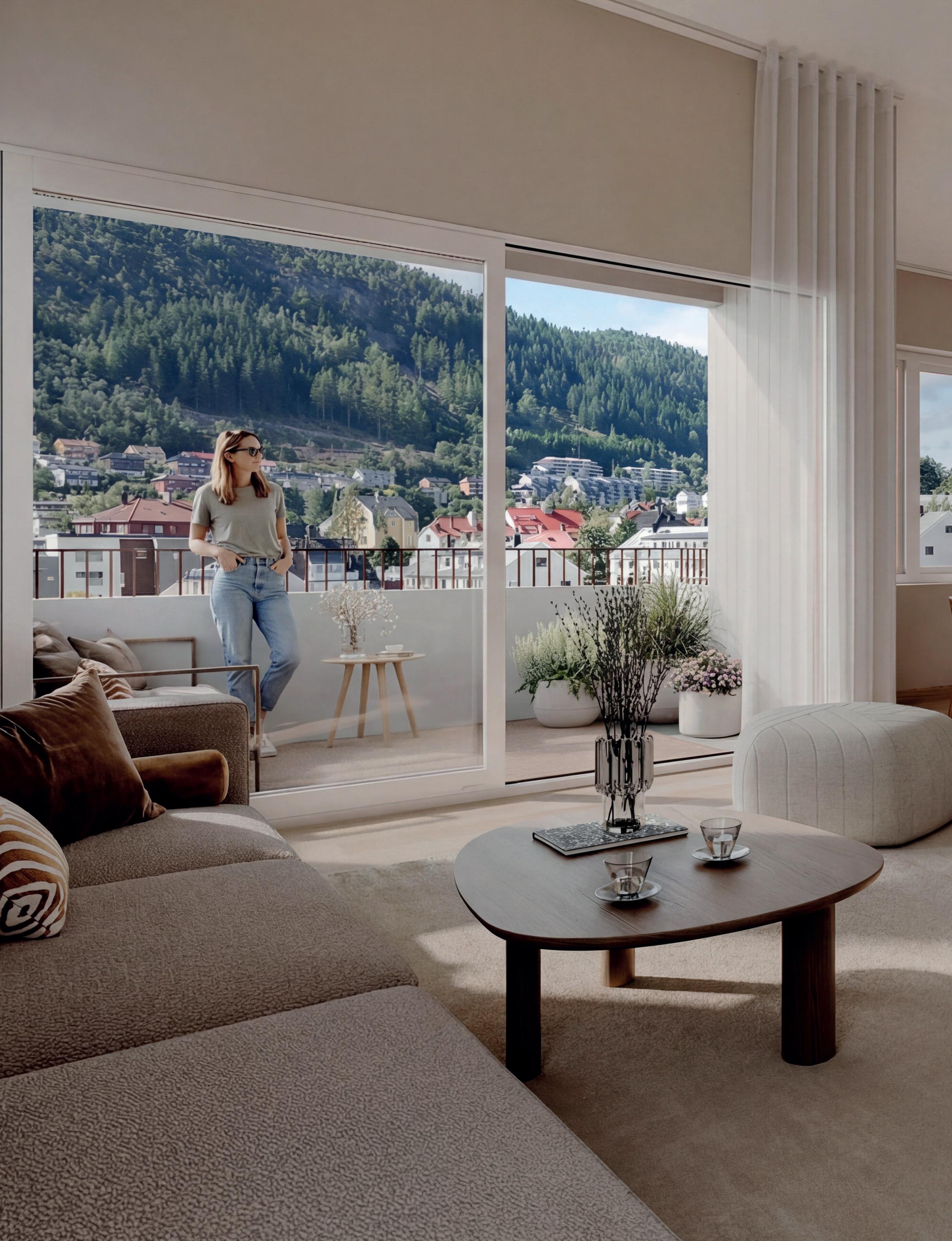 Utsikten varierer fra leilighet til leilighet, velger du en av de øverste etasjene kan du glede deg over høy og fri utsikt mot både Løvstakken og byen. Her ligger det til rette for solrike sommerdager og lange, lune kvelder ute.