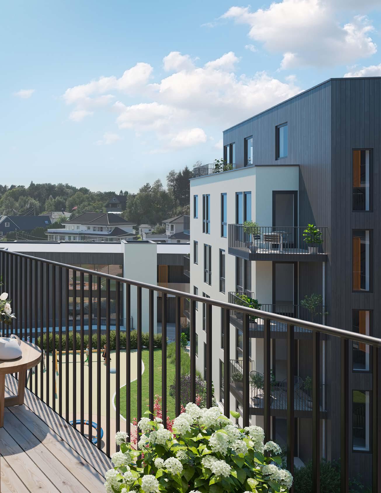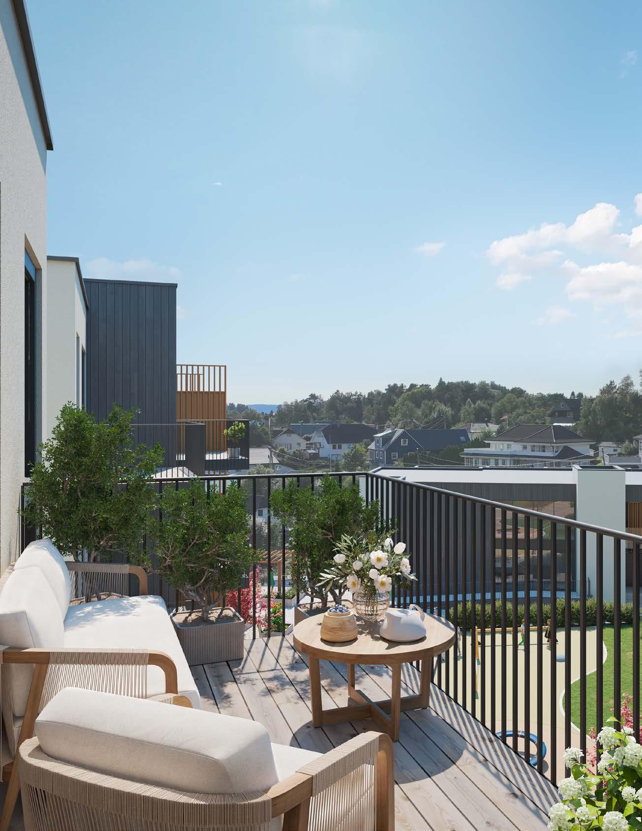 3D-illustrasjon fra balkongen til leilighet F0404 i hus F. Avvik kan forekomme.