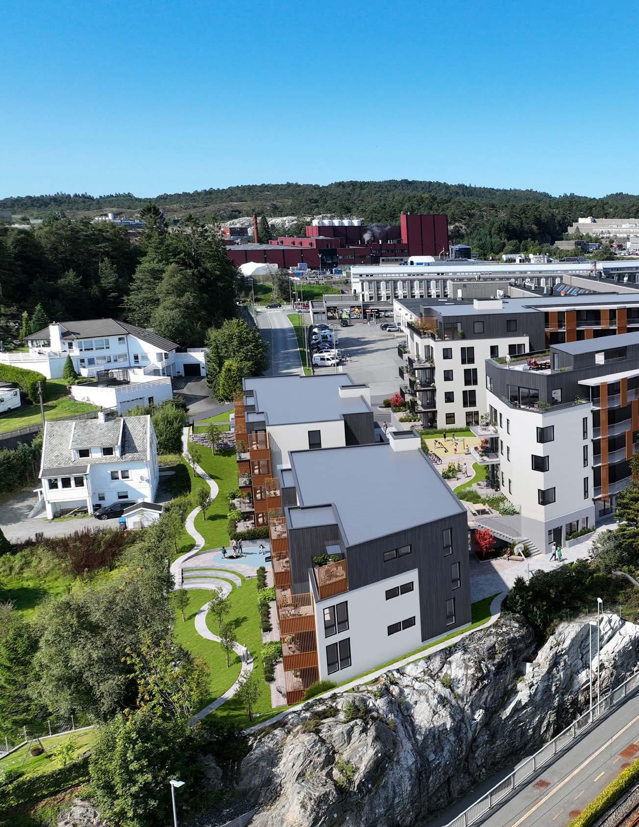 Første trinn ut er 73 nye boliger beliggende høyt og fritt på kollen ved bybanestoppet på Kokstad. Byggingen er godt i gang og de første kan flytte inn allerede våren 2025.