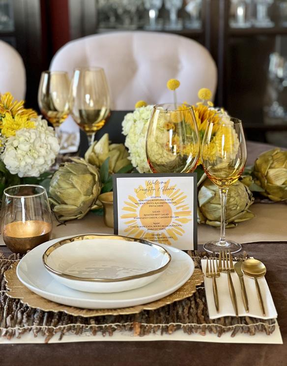With this newfound inspiration, I began planning an Italian-inspired menu featuring cauliflower soup, beet salad, chicken piccata, and panna cotta. The table scape is crucial, as it sets the tone and envelops your guests in the theme. I often start with flower arrangements for the centerpiece, and Trader Joe’s is my go-to for unique, beautiful, and costeffective flowers. For this party, I chose vibrant sunflowers and elegant hydrangeas, complemented by other interesting white and yellow blooms. Faux artichokes, a rustic brown butcher paper runner, and votive candles