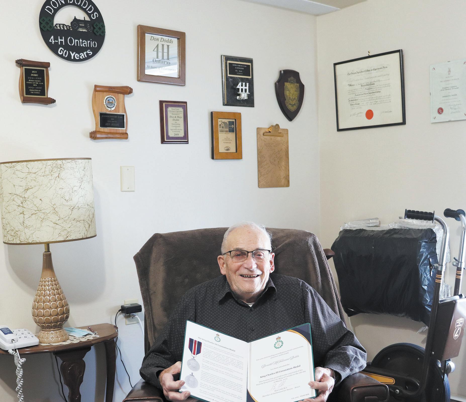 Speaking of which, Dodds started his time with Huron County 4-H when he was young, just as a humble member of the local swine club. That year, in the early 1950s, Dodds’ club leader suggested that he take part in the 4-H association’s annual judging competition the following spring. He won the Junior Section of that competition, earning a handsome plaque that hangs on his wall in his Goderich Place bedroom even today, alongside a number of other accolades he’s received over the years.