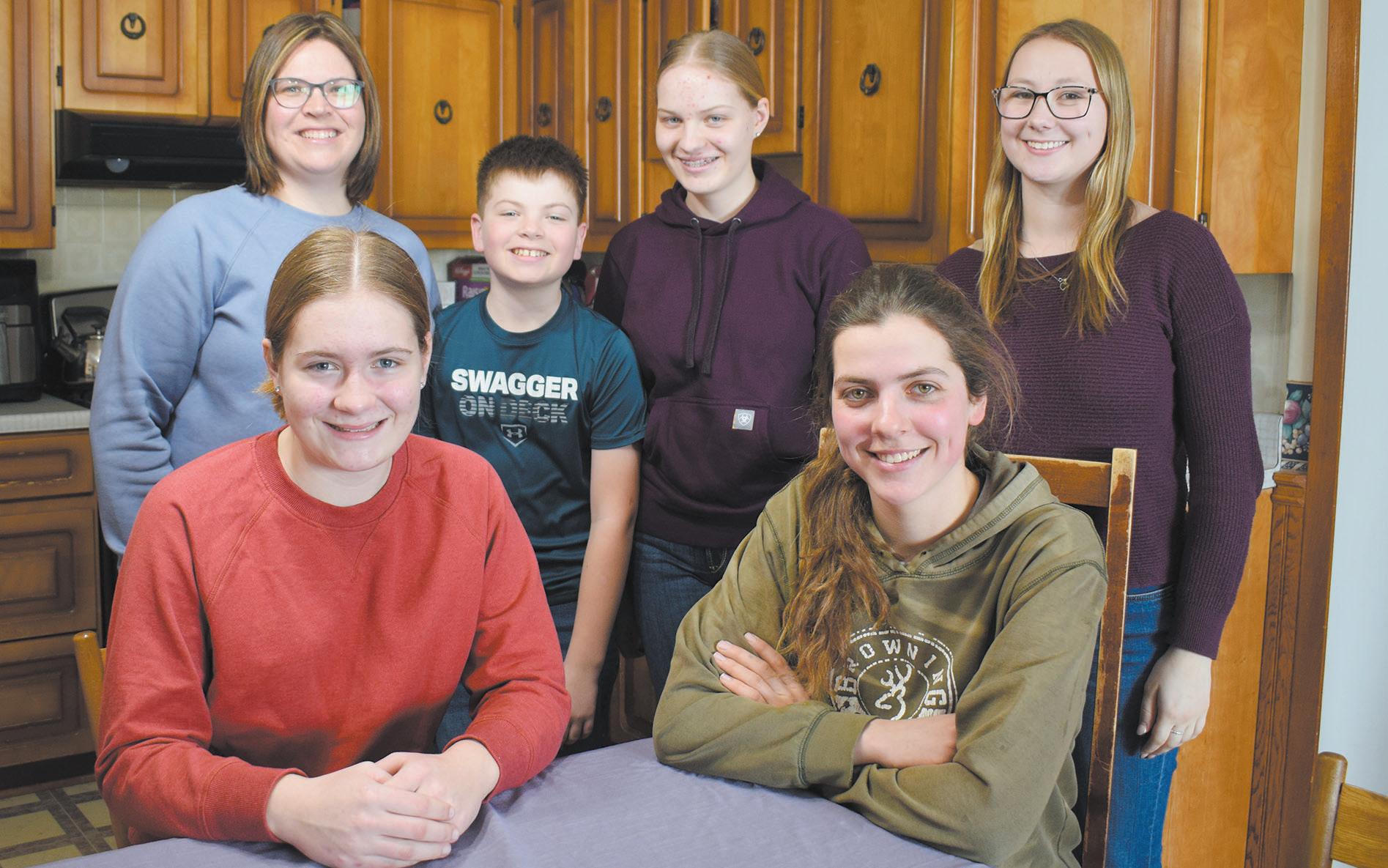 On a snowy day in early March, members of the South Huron Sheep Club (SHSC) gathered at the Gross family farm near Auburn for a conversation about their growing success in sheep showing. Seated, from left, are Loralei Gross and Evy Verschaeve, with, standing from left, Mary Ellen Gross, Gavin Gross, Holly Gross and Rachel Gras. (Scott Stephenson photo)